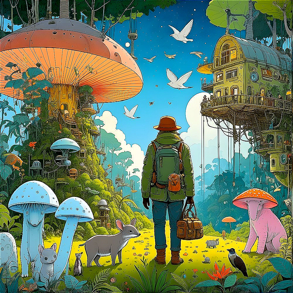 A whimsical, colorful forest scene with oversized mushrooms and peculiar animals. A traveler stands before charming tree houses, surrounded by vibrant flora and flying birds under a bright sky.