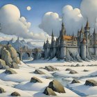 A surreal landscape features towering castles with intricate architecture, surrounded by snowy terrain and flowing water. Large, cloud-like formations and twin celestial bodies create an otherworldly atmosphere.