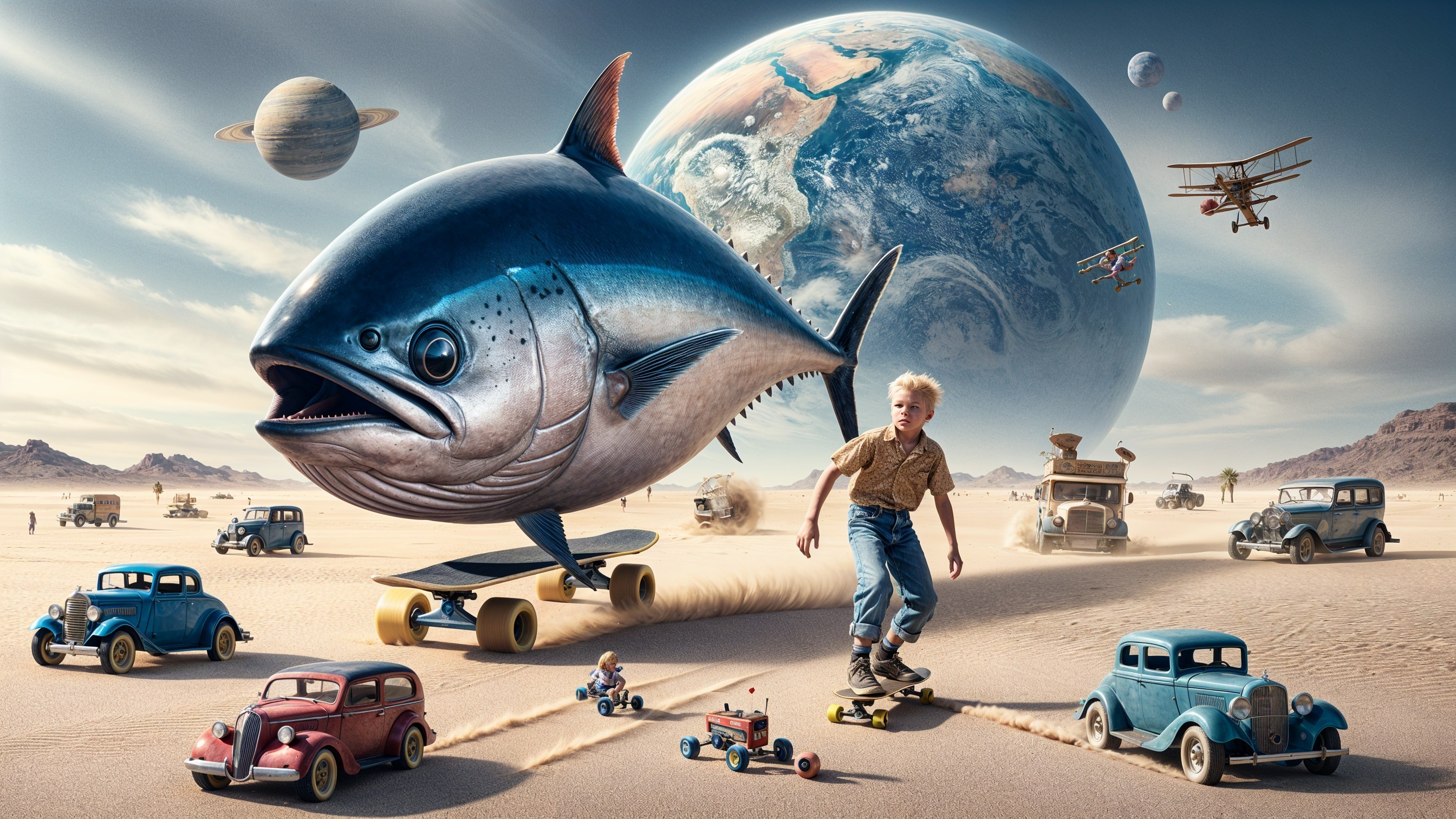Prompt: a large old Blue Fin Tuna and a small young blond haired boy, each on a skateboard racing across a flat desert landscape, a huge earth type planet above them, a couple toys from the 1930's are laying around in the sand