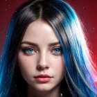 Vivid red and blue surreal portrait, woman fusion reality imagination, photorealistic precision, fine surrealist detailing, calm powerful face, intricate flowing patterns, white milk black honey, organic intertwining motion balance, purity depth tension, raw tactile energy, foampunk-inspired aesthetic, biological texture industrial undertones, chrome silver tones, dimensional realism, acrylic layering technique, rich tonal depth translucent washes, living breathing texture, quiet intensity gaze, resilience reflection, monochrome world, sharp high-definition focus, visionary style, Alex Grey, symbolic duality light dark, softness steel, transformation strength contrast.