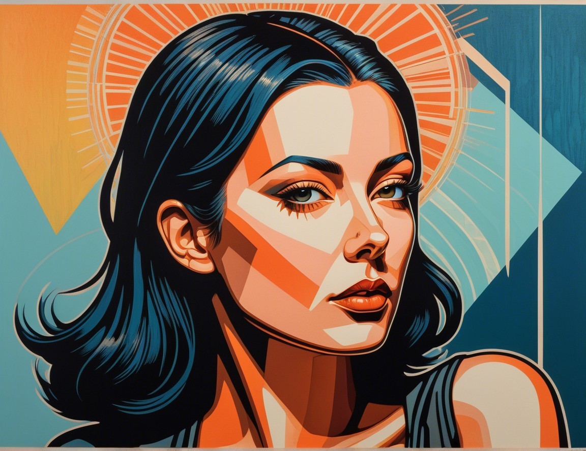 Prompt: foampunk portrait, stylized female headshot blending abstract sci-fi elements with bold outlining and orphism featuring geometrical 3D effects, linocut by Brock Hofer merged with retro-futurism and american gothic by Remedios Varo. Translucent and illuminated contrasting colors, emphasizing shadows and highlights, visually brightened, collagraphy, great depth and scale, tousled, opaque delicate tones in indiecore style, line-art, visibly textured layers, contoured, tactile feel, simplistic features, liminal, sculpted, asymmentrically detailed, parallax occlusion, ray-traced shadows 1.2, plasticity 1.3, complexion 1.1, custom_loss:edge, only curves, dynamic lighting 1.7, softened lighting, great depth and scale in brightened tones, american gothic 1.7, watercolor and ink style, hdr, VFX-inspired, precise Gelsculpt 64K, novelty architecture, dethereal, chibli, ((layered paper texture, (vibrant hues, (softened beige, goldenrut-yellow, light-blue), highly emotional), 3 layers of dof), 9:13, coherent line-art features), multi-layered eyes, joyful, gradient inking watercolors, asymmentrical geometric lines, line-art, HDR, stippled, raytraced shadow effects, visible textures, creating a coherent line-artwork. Gothical fantasy, offset lilthography, contouring outlines, baked-milk-tones contoured by black ink, micro-pen lines, watercolor effects akin to adorable psychedelic art by Stan Lee, american gothic, triadic color scheme of light-yellow, warm beige, and blue in textures, stippled shadow effects, visible textures, coherent line-artwork by david graeme Baker and Marc Allante, delicate warm tones in watercolor and ink style, tesselated features, hues by Ed Binkley, Wet on wet painting, fantasy, tonalism, unparalleled detail, splash ink technique in style of Marc Allante, colorful yam, warm coloring, dark-yellow, metallic-honey, soft rounded edges, Pencil and Pastels, ink and alcohol, highly stylized art merged with fantasy illustration, crisp quality, color scheme