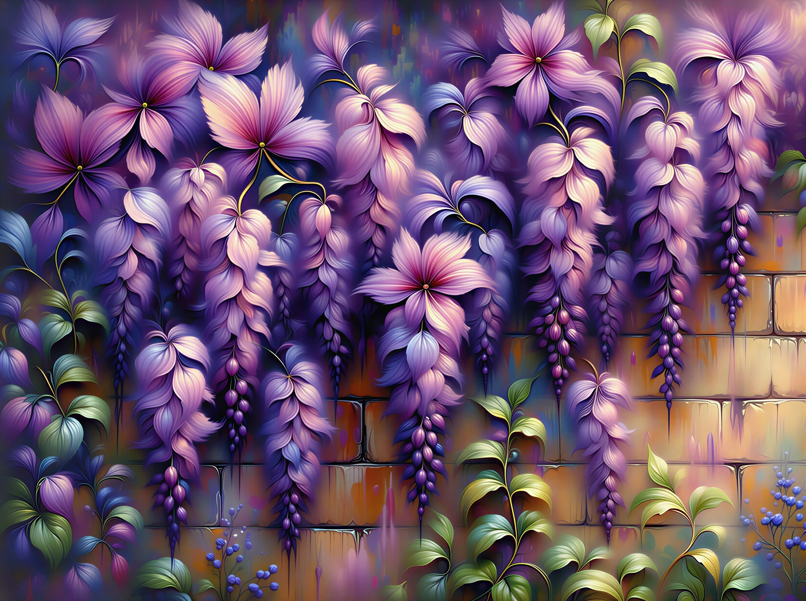 Wisteria-like vines cascading downwards. Some flowers have pointed petals, resembling stars or pinwheels, while others have rounded, layered petals, like roses.