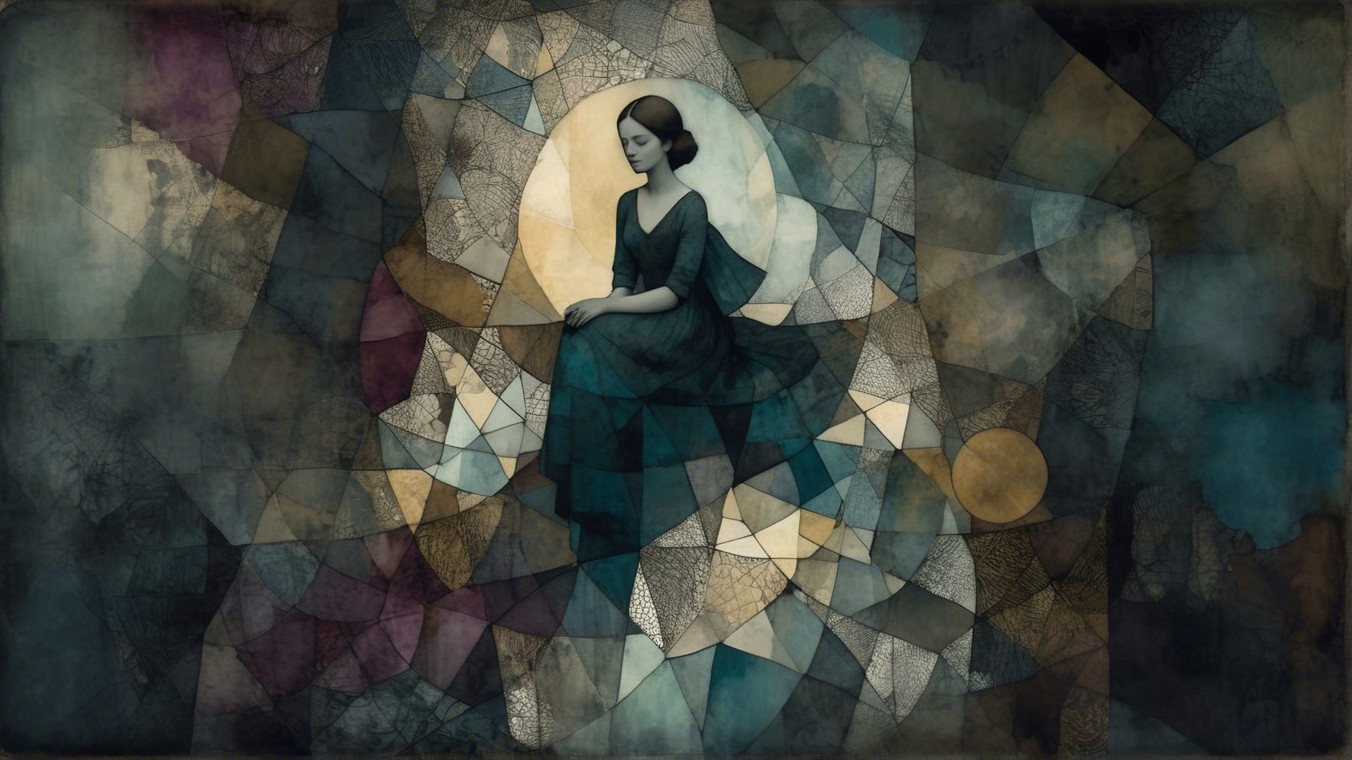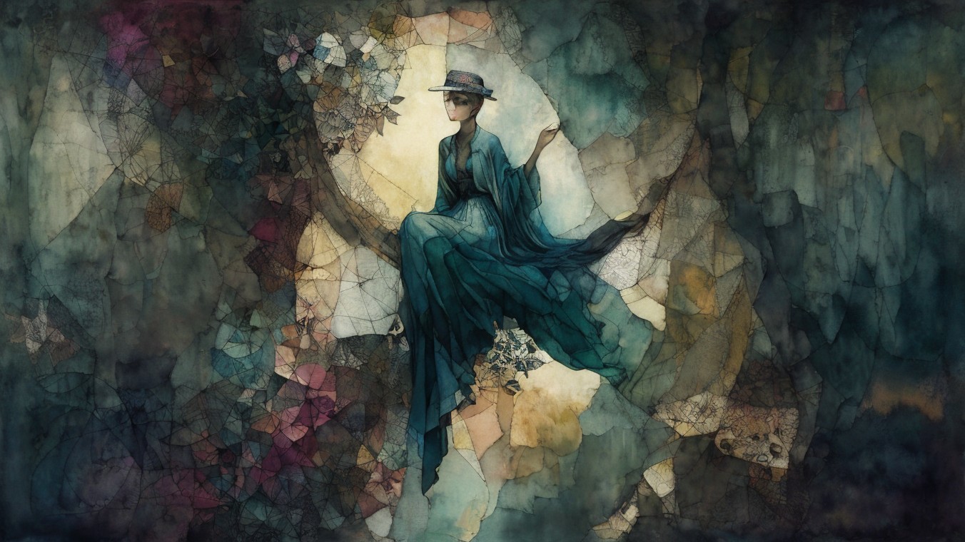 Patchwork fading tones of melancholy vintage summer nostalgia, soul search in portrait in ochre, patina of wine stains, mercury glass. Light and gossamer haze. art brut, moody, somber, desaturated colors, in the style of Paul Klee, Arthur Rackham, Banksy Stunning stylized, beautiful woman, intricate zentangle illustration, watercolor and ink painting, meticulous detail with fine pen strokes, intricate patterns, fractals, ochre and indigo colors, Amanda Clark, Catrin Welz-Stein, Zdzisław Beksiński, and Dee Nickerson
