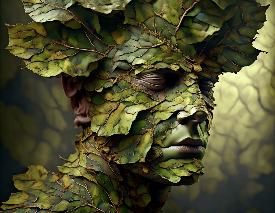 A vibrant artwork depicting a face integrated with leafy tree branches, embodying a serene, nature-inspired entity.