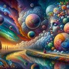 A surreal landscape features a vibrant sky with swirling colors and cosmic elements. A woman stands by a reflective river, surrounded by whimsical trees and colorful orbs, evoking a dreamlike atmosphere.