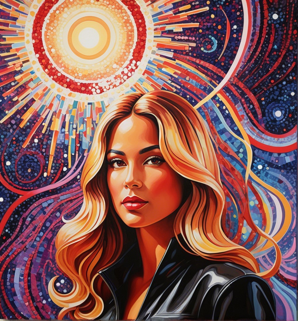 A vibrant artwork featuring a woman with flowing hair, set against a colorful, spiraling background of concentric circles and radiant patterns, evoking a sense of warmth and energy.