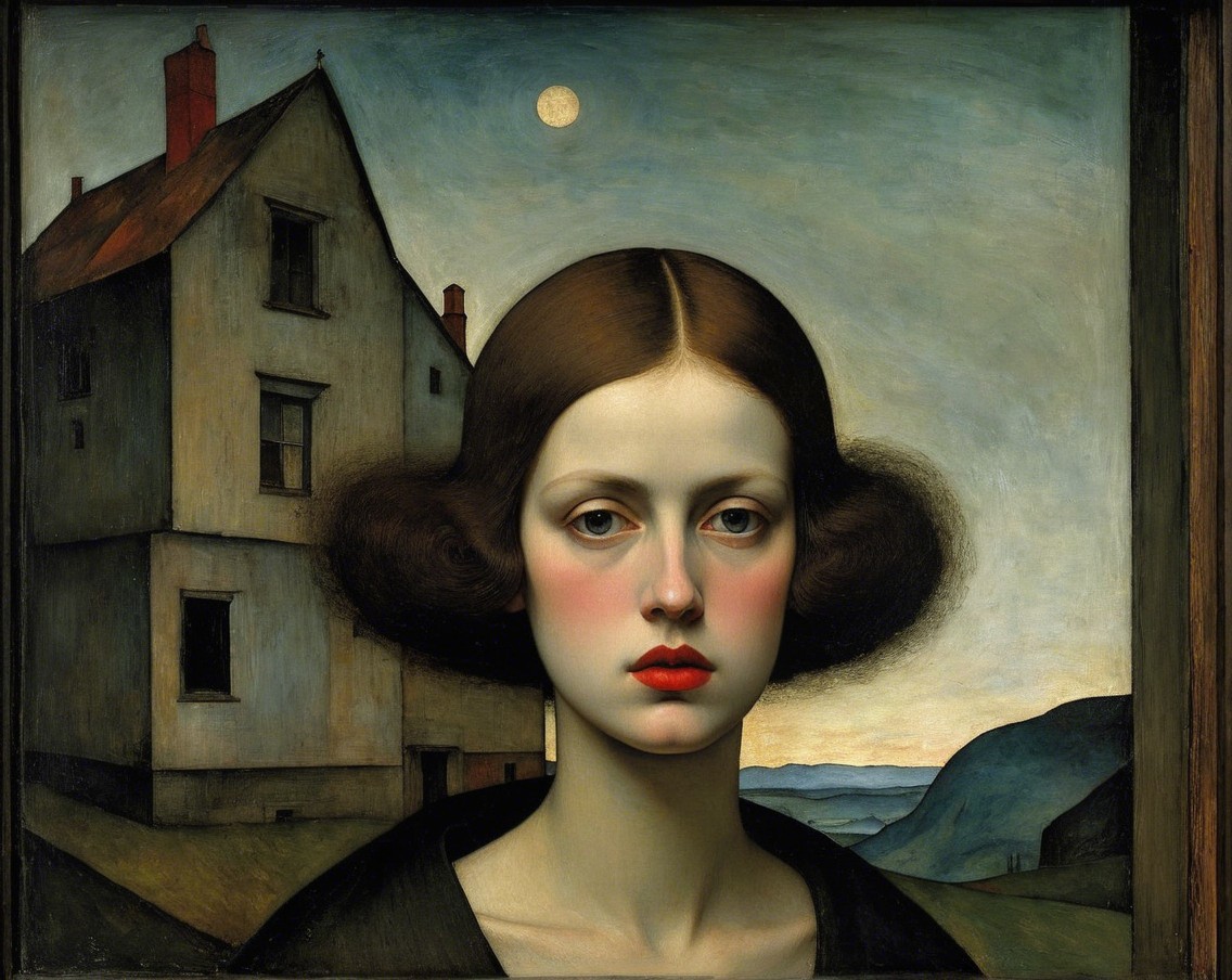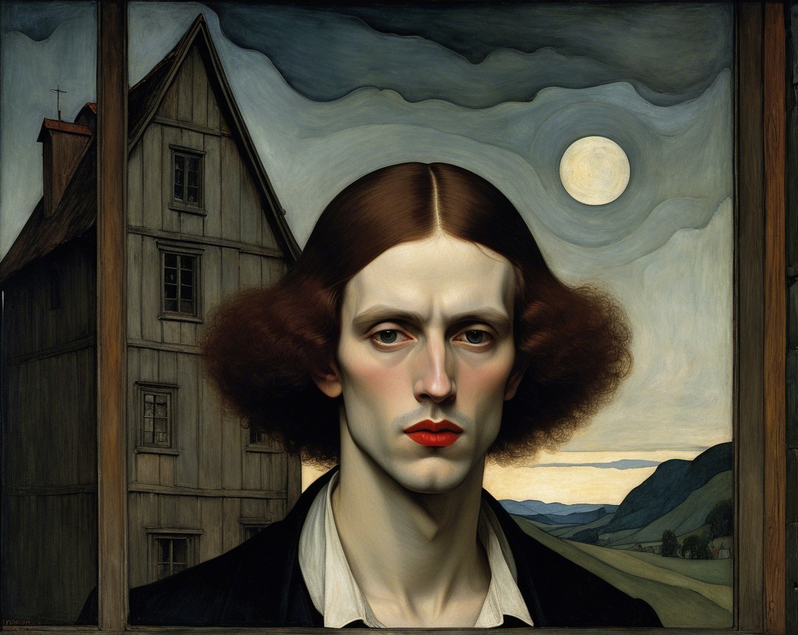 The image depicts a pale-faced man with slicked-back hair, holding a red flower, set against a dark, moonlit forest. His expression is intense and enigmatic, framed by window panes.