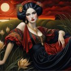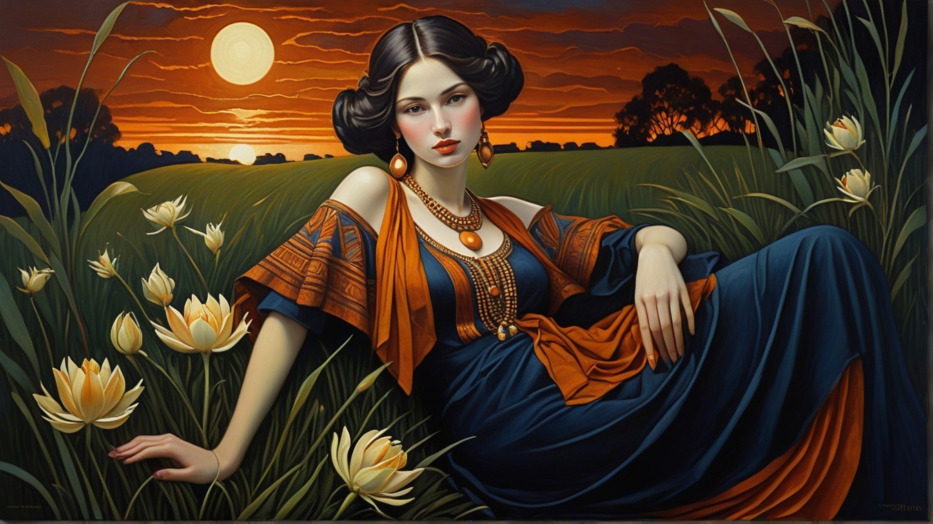 A beautiful woman with dark hair styled in an updo, wearing a blue and orange dress accessorized with an ornate copper necklace and earrings, reclines amidst tall green grass and white water lilies, set against a vibrant orange and yellow sunset with trees silhouetted in the background.