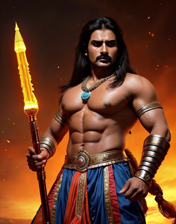 A muscular man in traditional warrior attire holds a glowing spear against a dramatic sky backdrop.