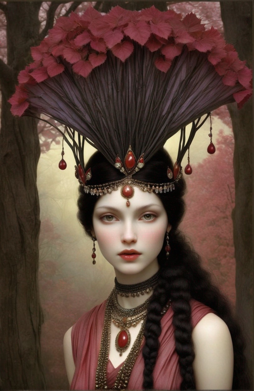 + Prompt:Morea is the name of another female dryad that lives on mulberry trees. Dryad priestess in flowing shawls, by Nicoletta Ceccoli, by Kay Nielsen