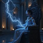 A full-body shot of a young woman with long, curly brown hair wearing a white embroidered lace lingerie set with a flowing sheer robe and white heeled sandals, standing inside a large, ornate gothic cathedral with high ceilings, tall pillars, and stained-glass windows, some with depictions of religious scenes