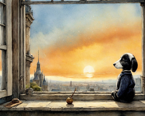 A serene landscape features two figures in flowing dresses amidst vibrant flowers. A grand spired tower rises in the distance, reflecting in a calm river, with a warm, glowing sunset above.