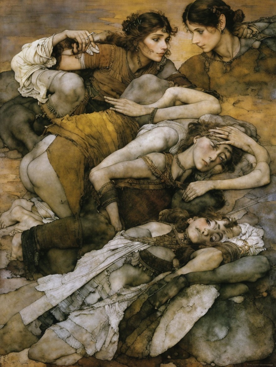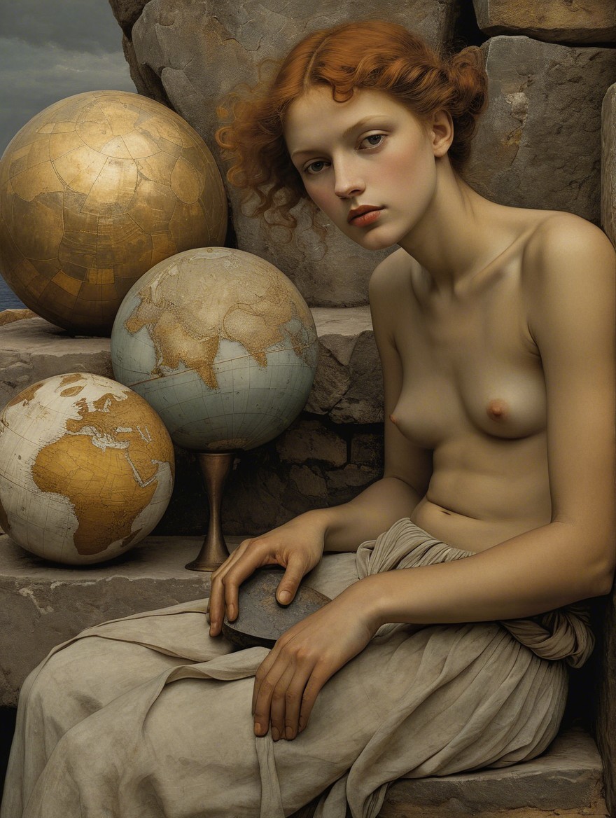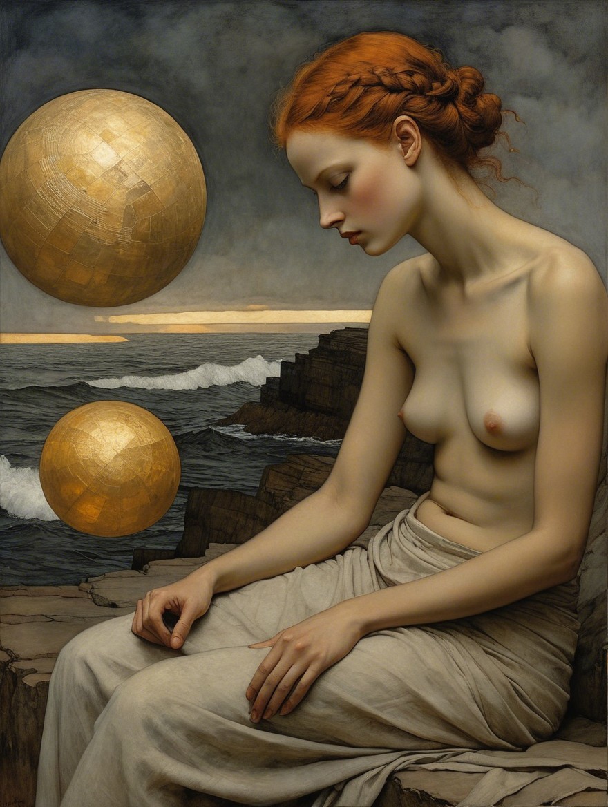 The image features a muscular young man with long, reddish hair gazing thoughtfully towards a large golden sun setting over a tranquil sea, his expression serene against the dramatic backdrop.