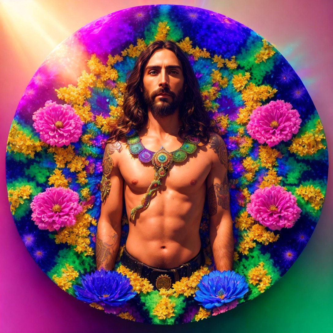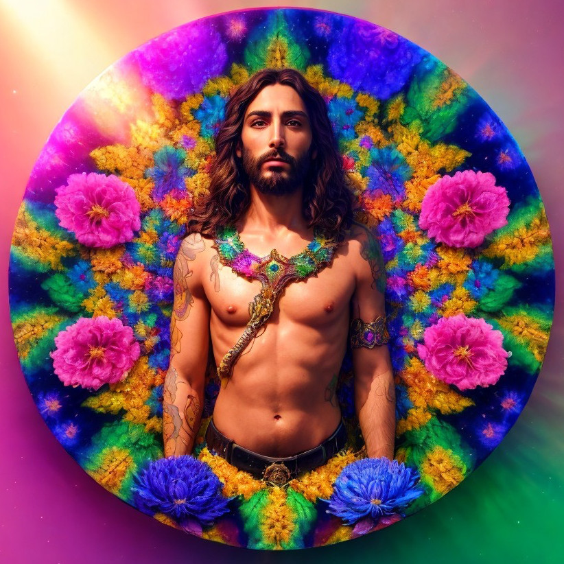 Person with long hair and beard in floral background