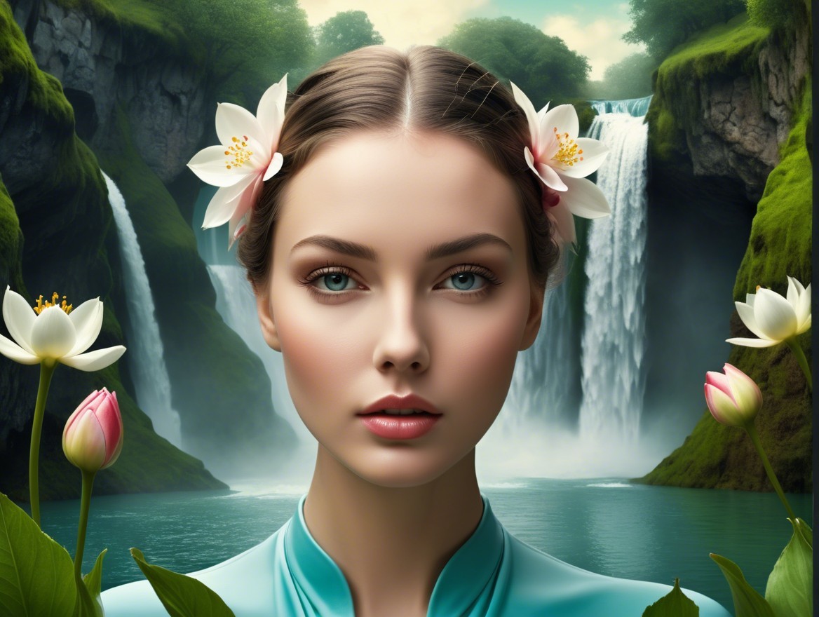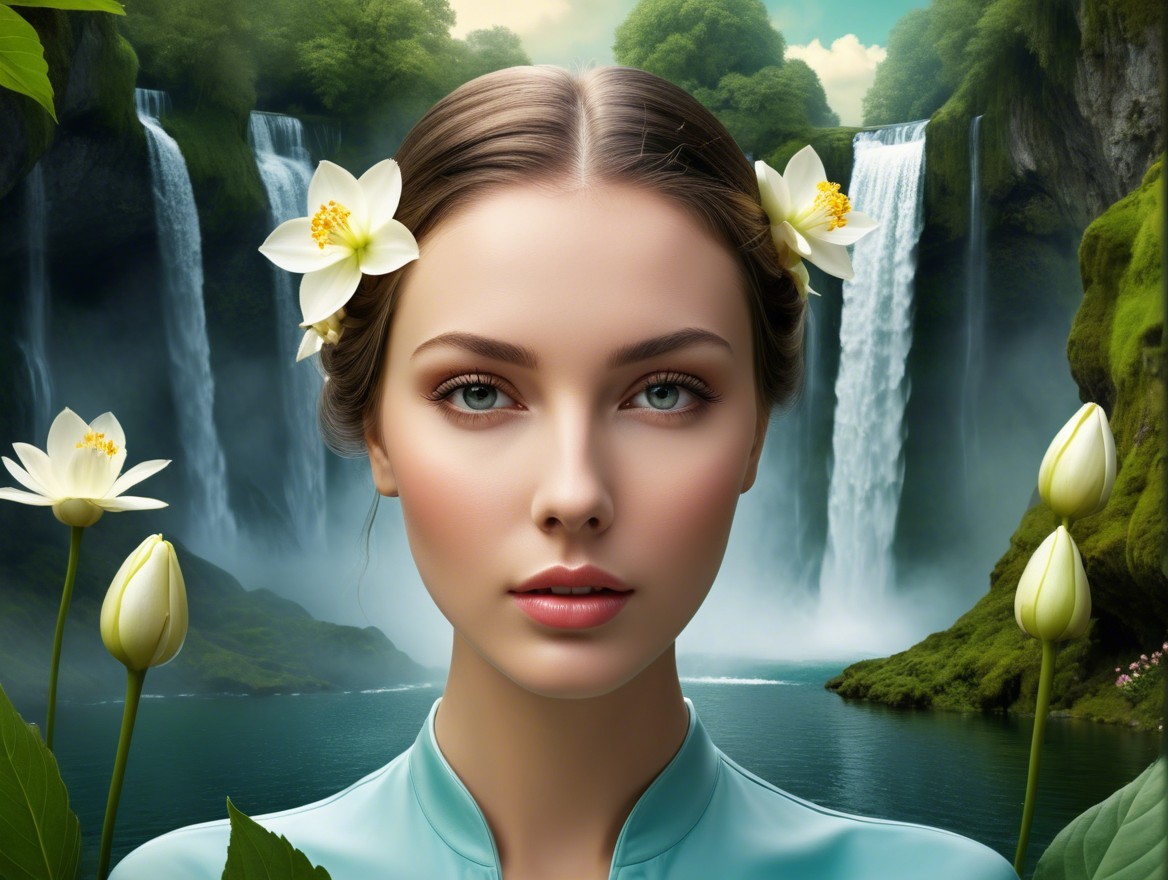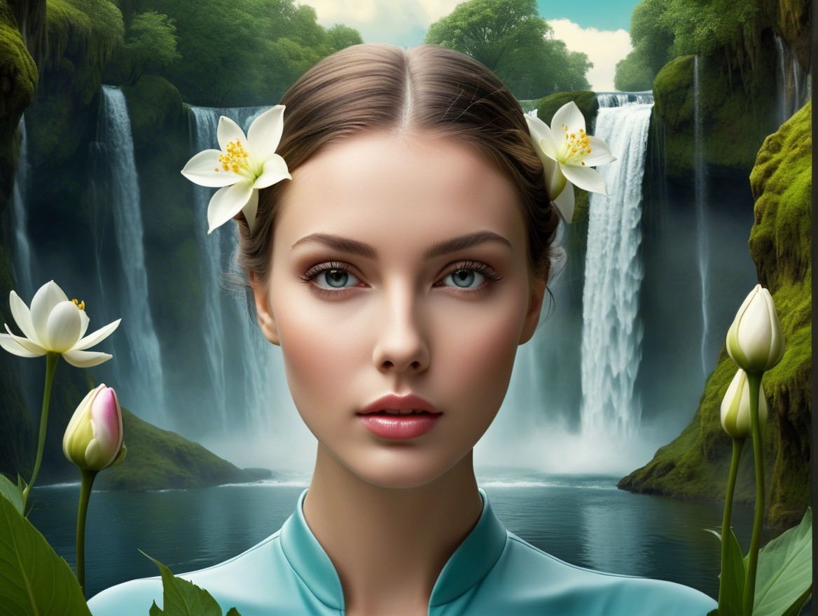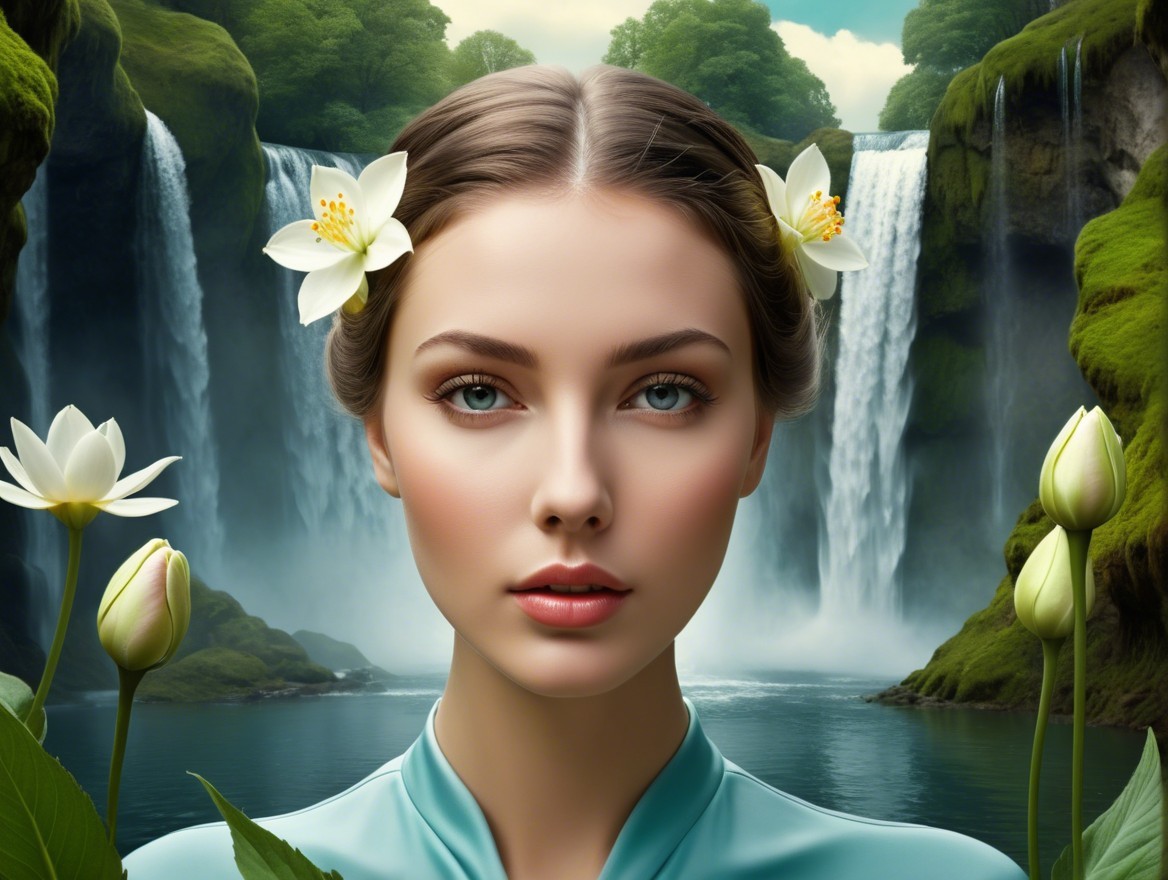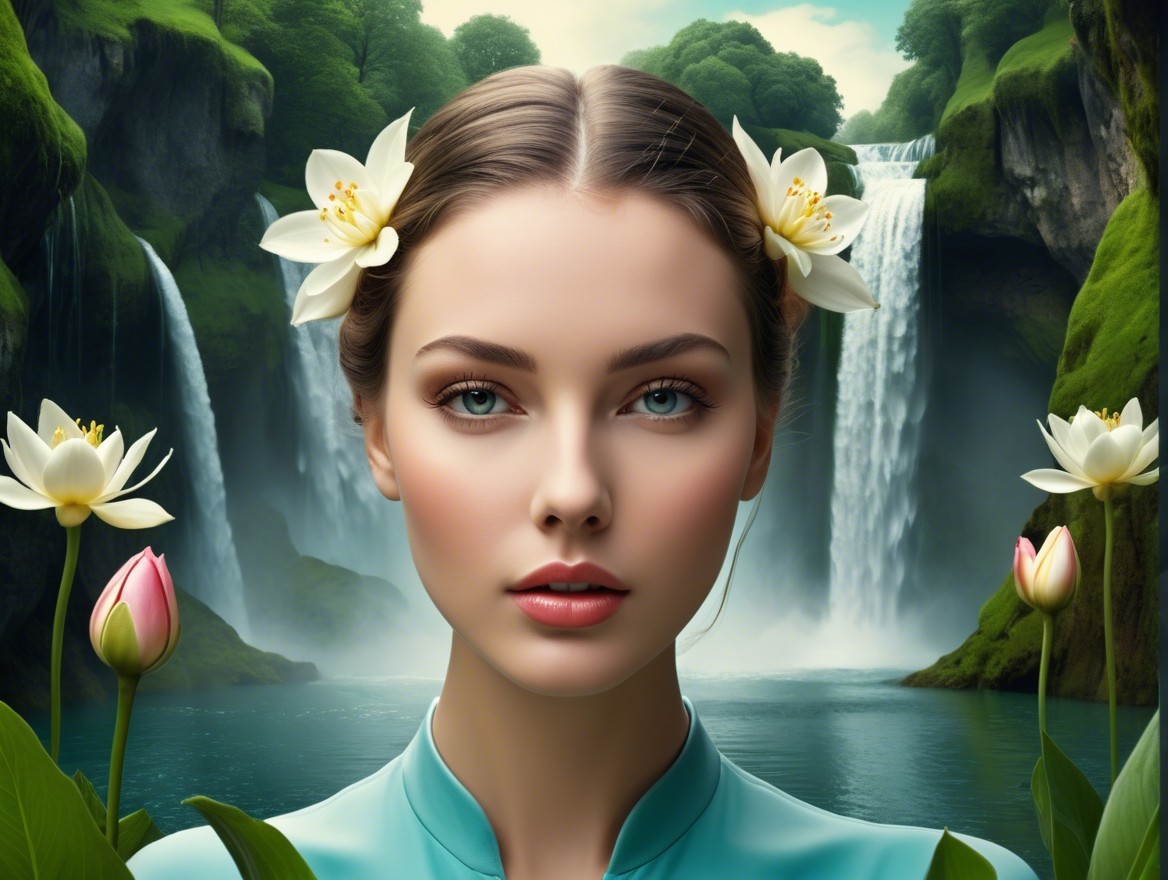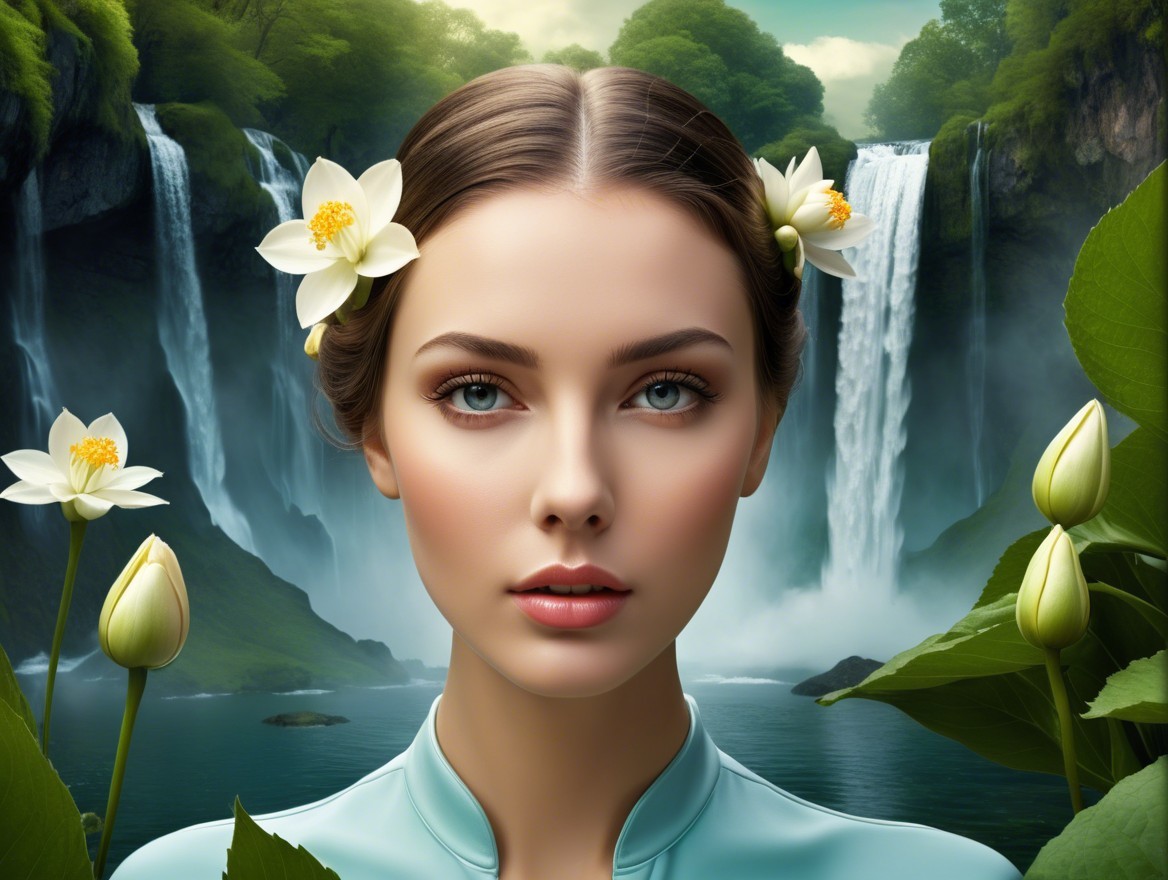 A serene woman with flowers in her hair gazes thoughtfully at the viewer. Lush greenery and cascading waterfalls create a tranquil natural backdrop, enhancing her ethereal beauty.
