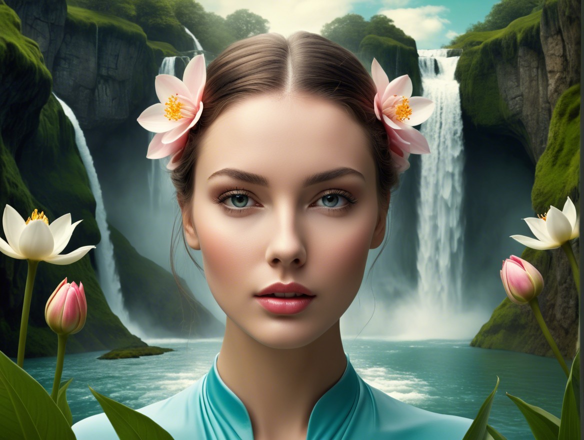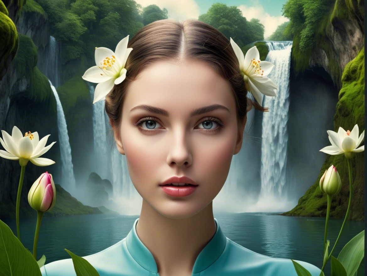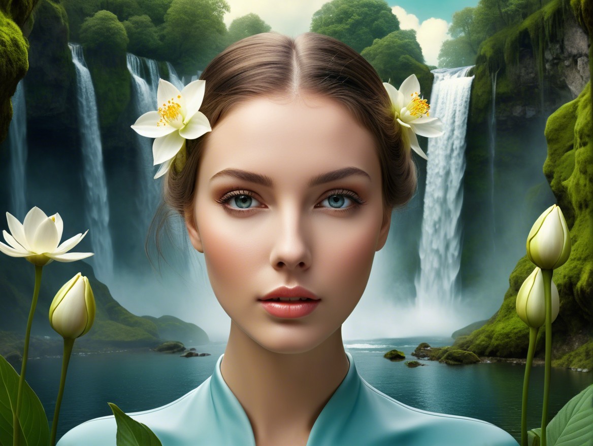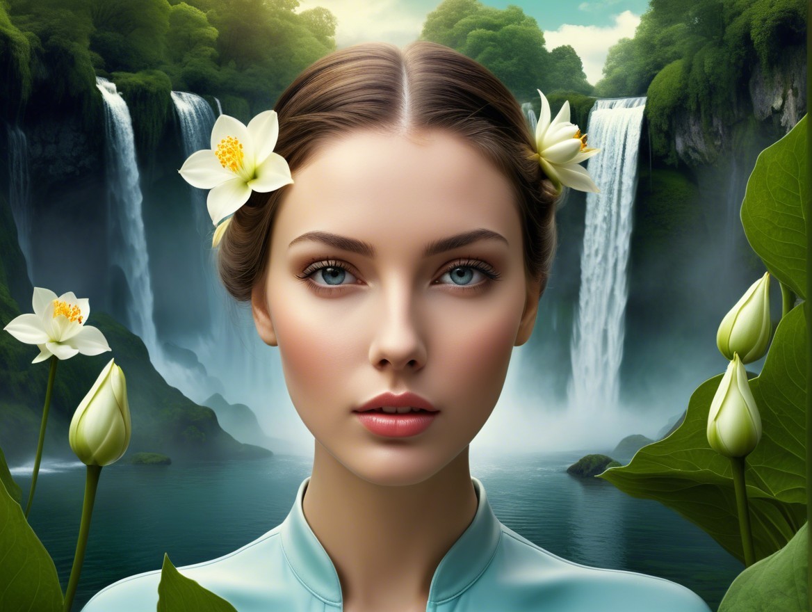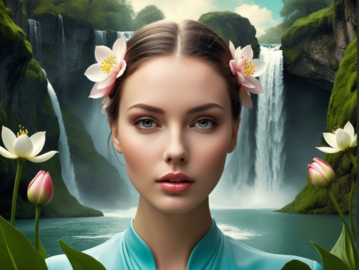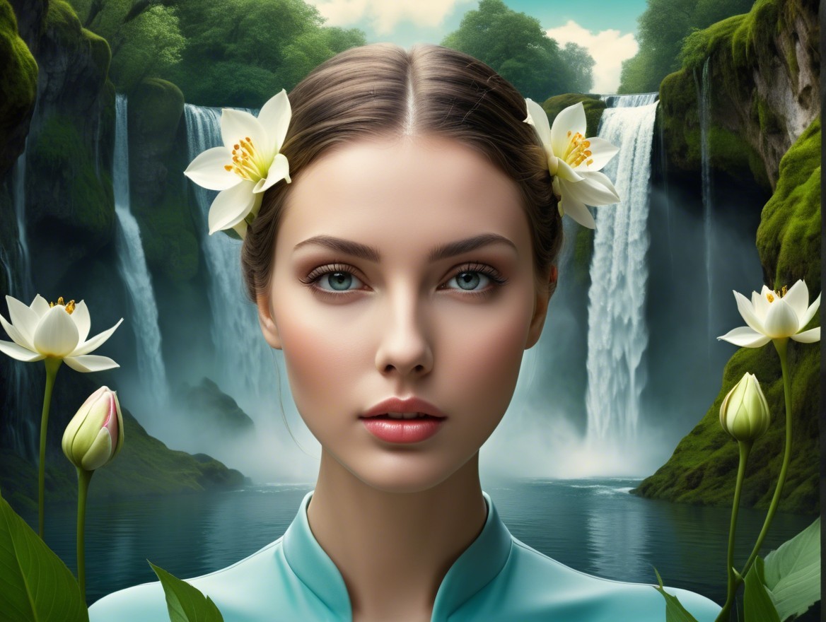 A serene woman with flowers in her hair gazes thoughtfully at the viewer. Lush greenery and cascading waterfalls create a tranquil natural backdrop, enhancing her ethereal beauty.