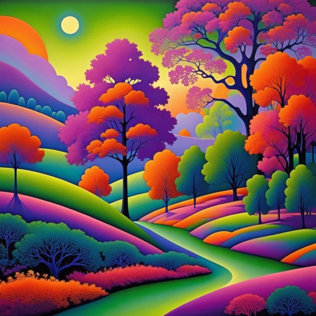 A vibrant, surreal landscape filled with colorful trees and rolling hills under a bright sun. The vivid shades of purple, orange, and green create a dreamlike, whimsical atmosphere.