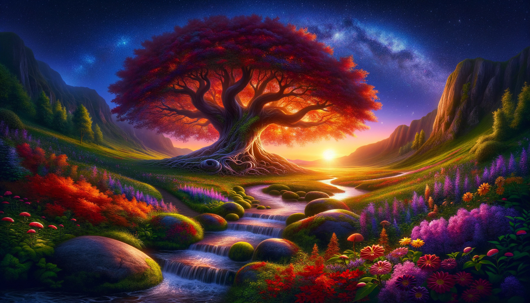 A majestic tree with a natural arch over a stream at sunset, set against rolling hills and a starry sky.