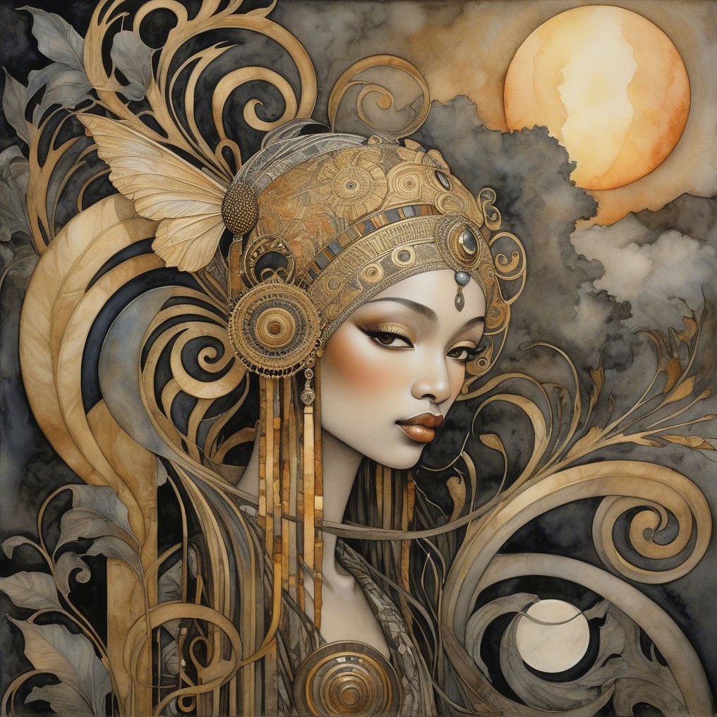 A beautifully intricate portrait of a woman wearing a colorful headdress, set against a warm, golden sunset with stylized trees and swirling patterns, evoking cultural richness and elegance.