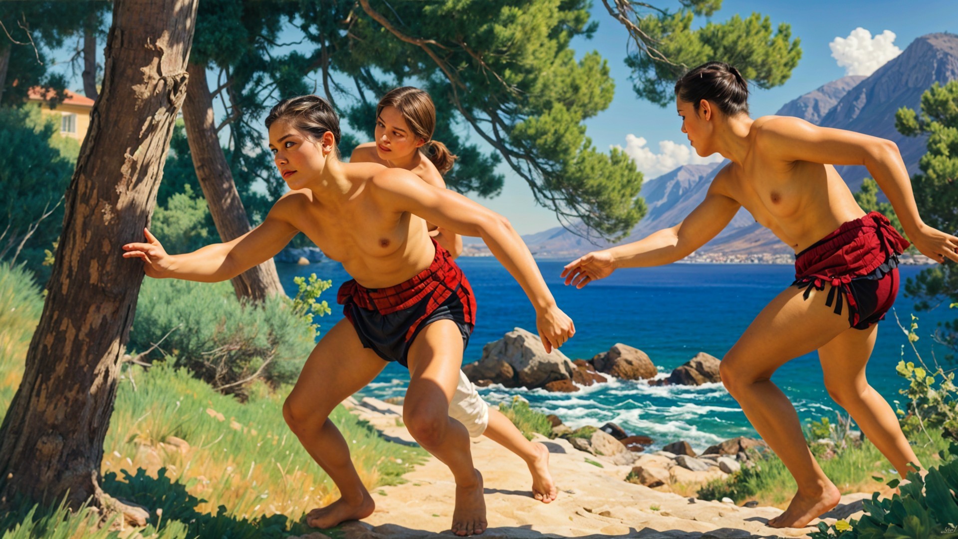 A group of three young friends joyfully runs along a coastal path, surrounded by lush greenery and dramatic mountains, with waves crashing in the background under a bright, sunny sky.