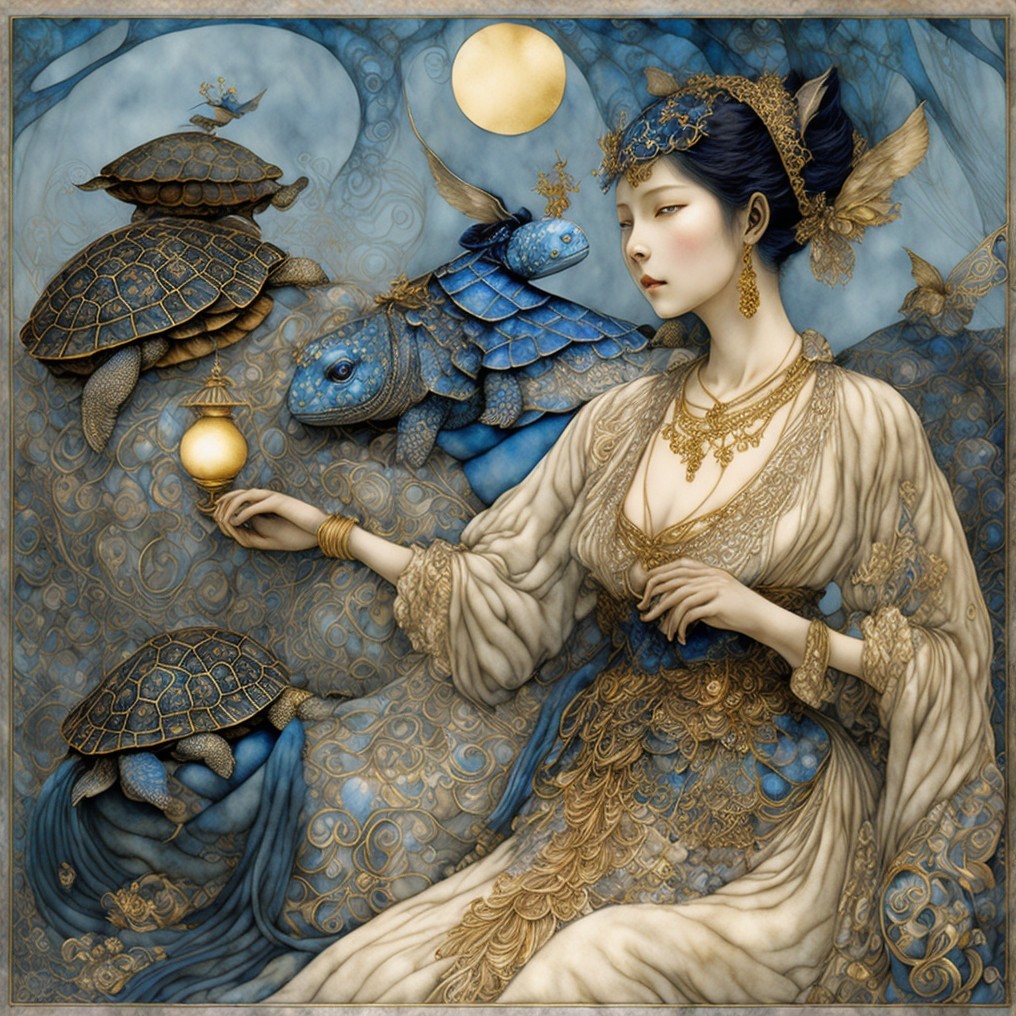 A serene woman in historical attire touches a large turtle against a backdrop of mystical castles and a yellow moon.