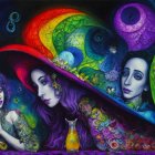 Three striking women with diverse hairstyles and vibrant outfits stand against a celestial backdrop. They are adorned with flowers and surrounded by glowing moons, radiating elegance and mystery.