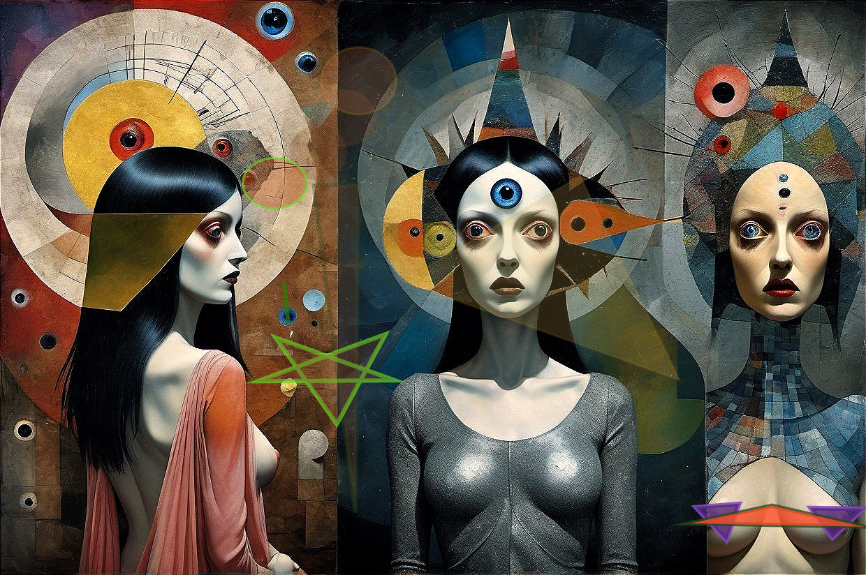 + Prompt:Photorealism, the void of a brain. a simulacrum of Igor Morski work. Eyes. Sci fi surrealism. Dave McKean mixed media. "Three goddesses of the deep cosmic evil, behind broken colored mirrors. Evil eye levitating. Paul Klee inspired, a mix of photorealistic Marc Chagall art collage and absurdism. metallic paint and newspaper clippings. Modifiers: dof portrait beautiful high detail colourful fine art Marc Chagall Cubism by Paul Klee By Dan Witz Stephen Gammel