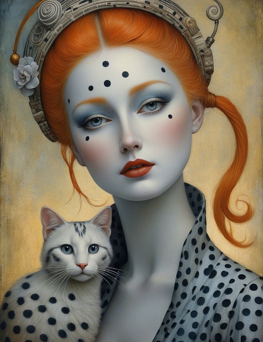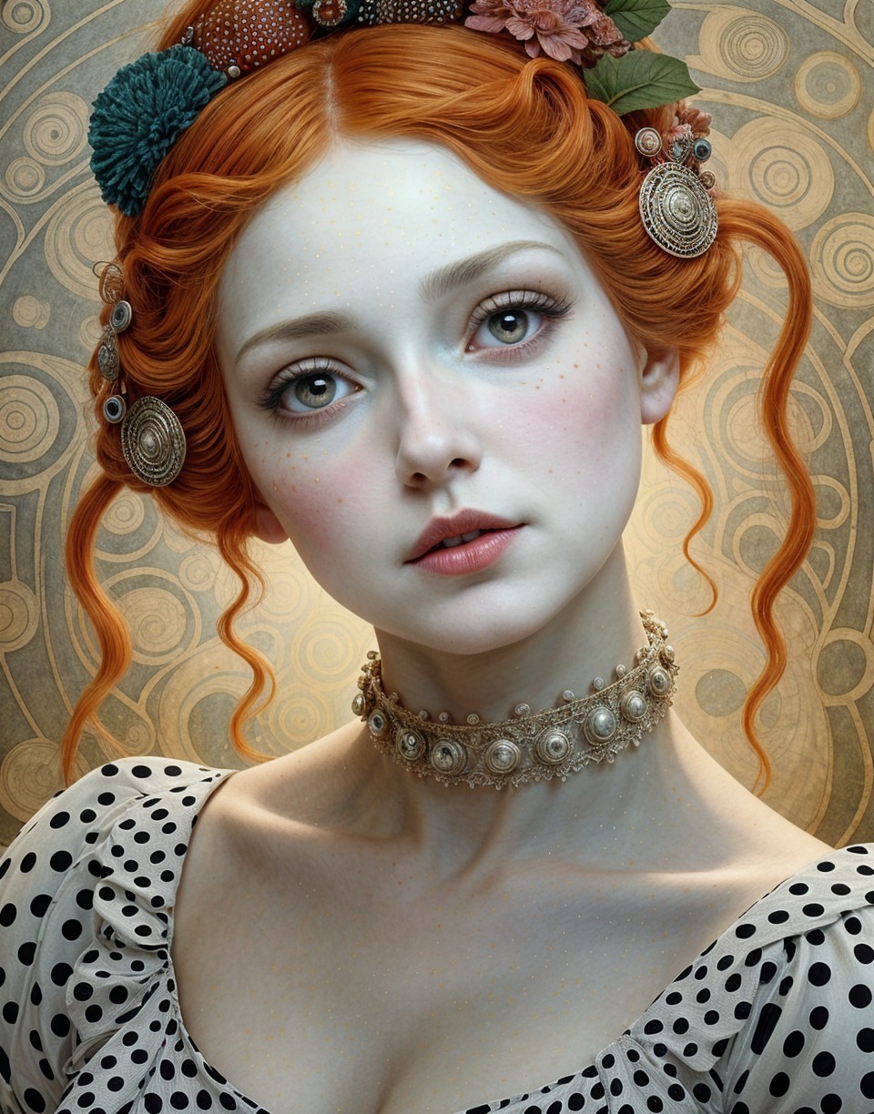 A striking figure with vibrant red hair and intricate jewelry gazes directly at the viewer, embodying a blend of elegance and modern artistry against a rich, ornamental background.