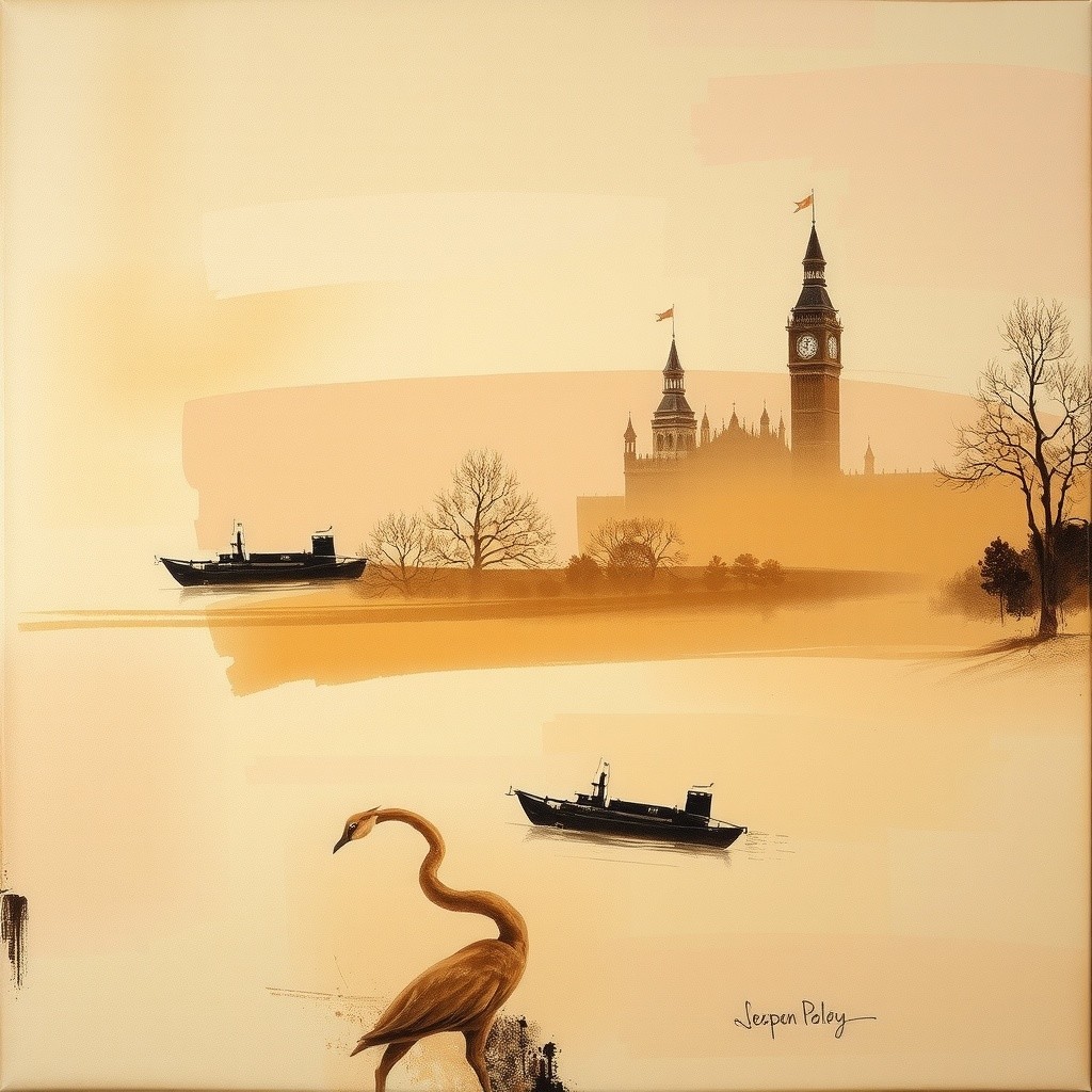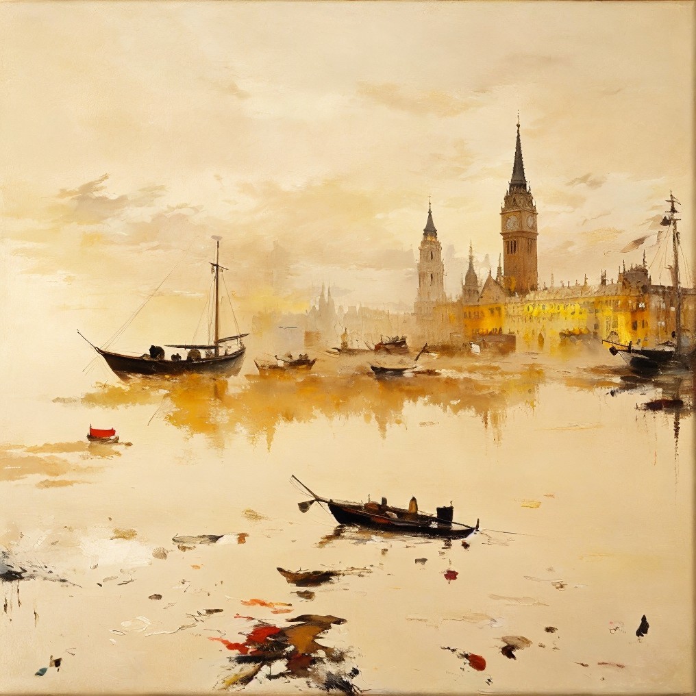 A serene painting captures a misty harbor scene with anchored ships and small boats. Soft hues blend, highlighting an old town with a prominent tower, evoking a sense of calm and nostalgia.