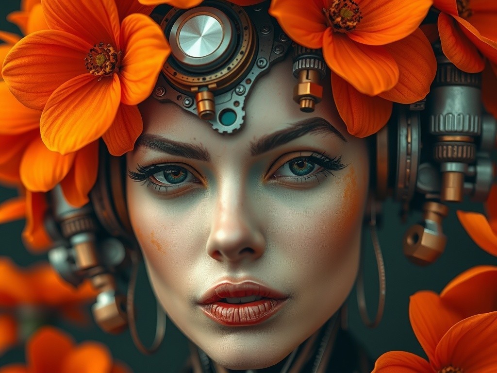 Prompt: "A striking portrait of a woman who is a flower with mechanical details,, and vibrant orange flower blossoms surrounding her, blending elements of beauty and technology in a captivating way. seamlessly integrated, stylized surreal and captivating, extrusion elements adding depth, blend of multi orange hues, burnt orange, organic and industrial/mechanical features, expressive face with natural details, inspired by Enki Bilal, HR Giger, Sampad, and Phillip Stearns, Alberto Burri’s experimental materials Anselm Kiefer's raw textures for a light decay appearance, high rust, rusting oxidized rust,and corrosive effects for added depth, mechanical nuances for an intricate look."