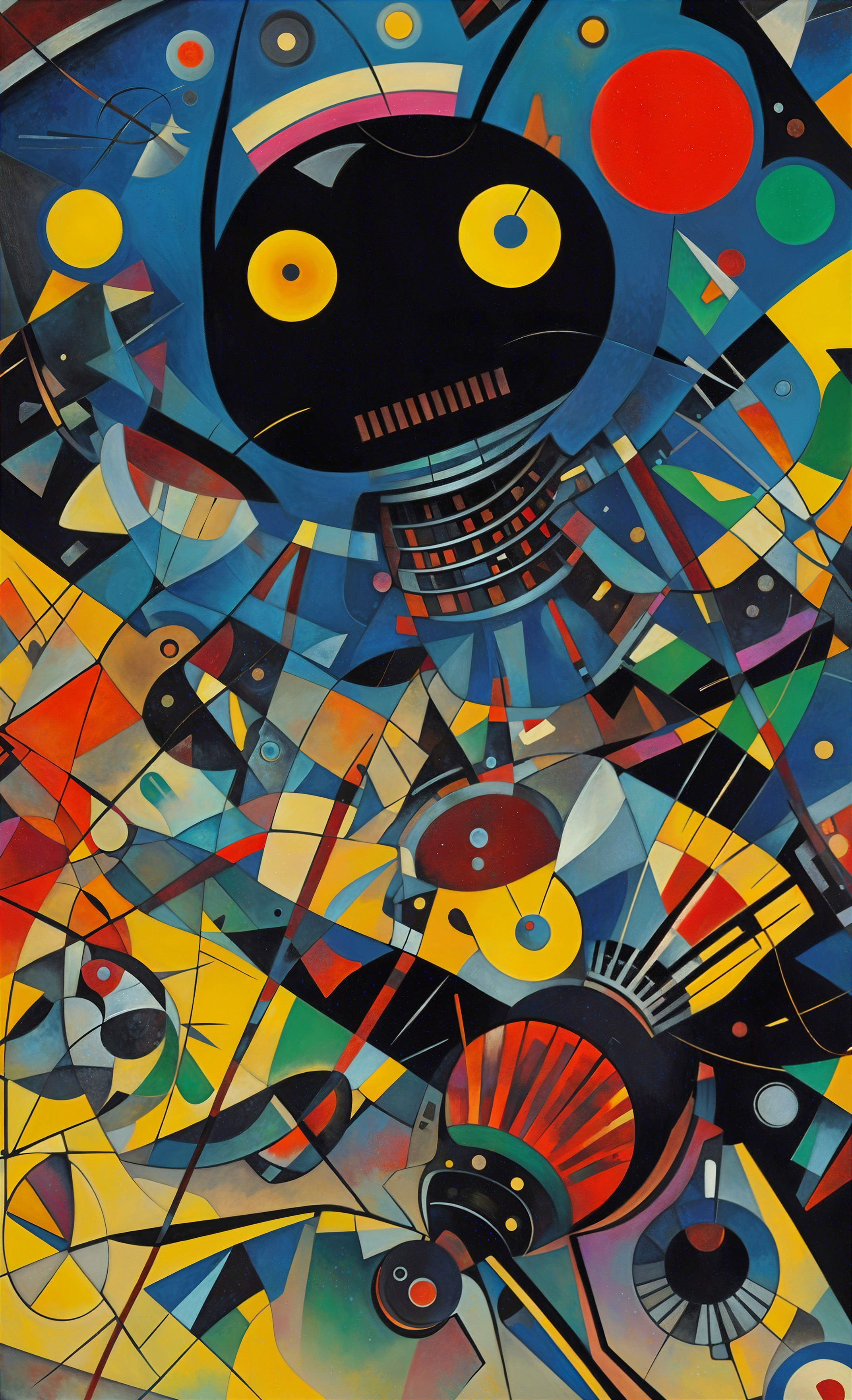 The image showcases a complex abstract composition featuring vibrant colours and geometric shapes. A central figure with large eyes dominates the scene, surrounded by dynamic patterns and playful elements.