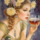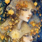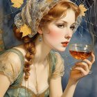 A woman with long, flowing red hair is adorned with pumpkins and a delicate spiderweb veil. Her captivating gaze complements the autumnal colors and whimsical atmosphere.