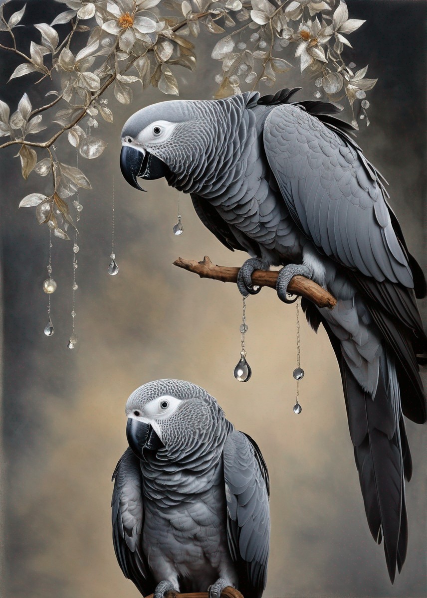 An African grey parrot perched beside vintage lanterns and an ornate birdcage with foliage inside.