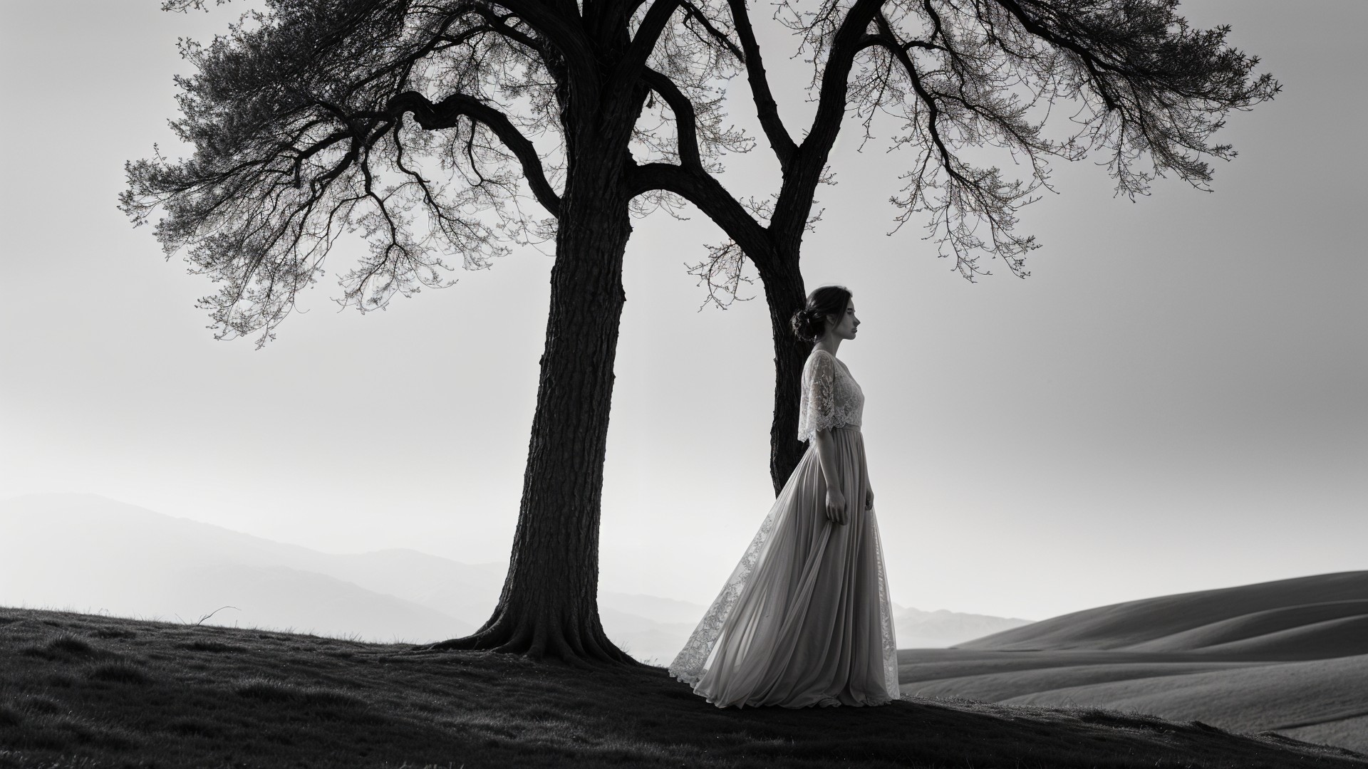 Prompt: "A solitary young woman embracing a tree in a stark, minimalist landscape, shot in fine art black and white photography, high-resolution, cinematic lighting. The setting is an expansive, empty terrain with a single, mature tree as the focal point, under a light-toned sky. The subject is draped in a flowing, floor-length dress paired with a delicate, lace shawl wrapped loosely around her shoulders. The artistic style leans towards classic, romantic, with a focus on evoking emotion through form and texture. The color palette is monochromatic, with a range of grayscale tones from deep blacks to soft whites, emphasizing light and shadow. The composition showcases a centered figure against the textured tree trunk, with a shallow depth of field that blurs the background to concentrate on the subject. The lighting suggests soft, diffused natural light, casting subtle shadows and highlights to accentuate the shawl's lacework. The texture details include the rough bark of the tree, the flowing fabric of the dress, and the intricate patterns of the lace shawl. The mood is contemplative and serene, with an atmosphere of solitude and connection to nature. Full shot, close-up of lacework, medium shot of face in profile. Grainy, reminiscent of film photography."