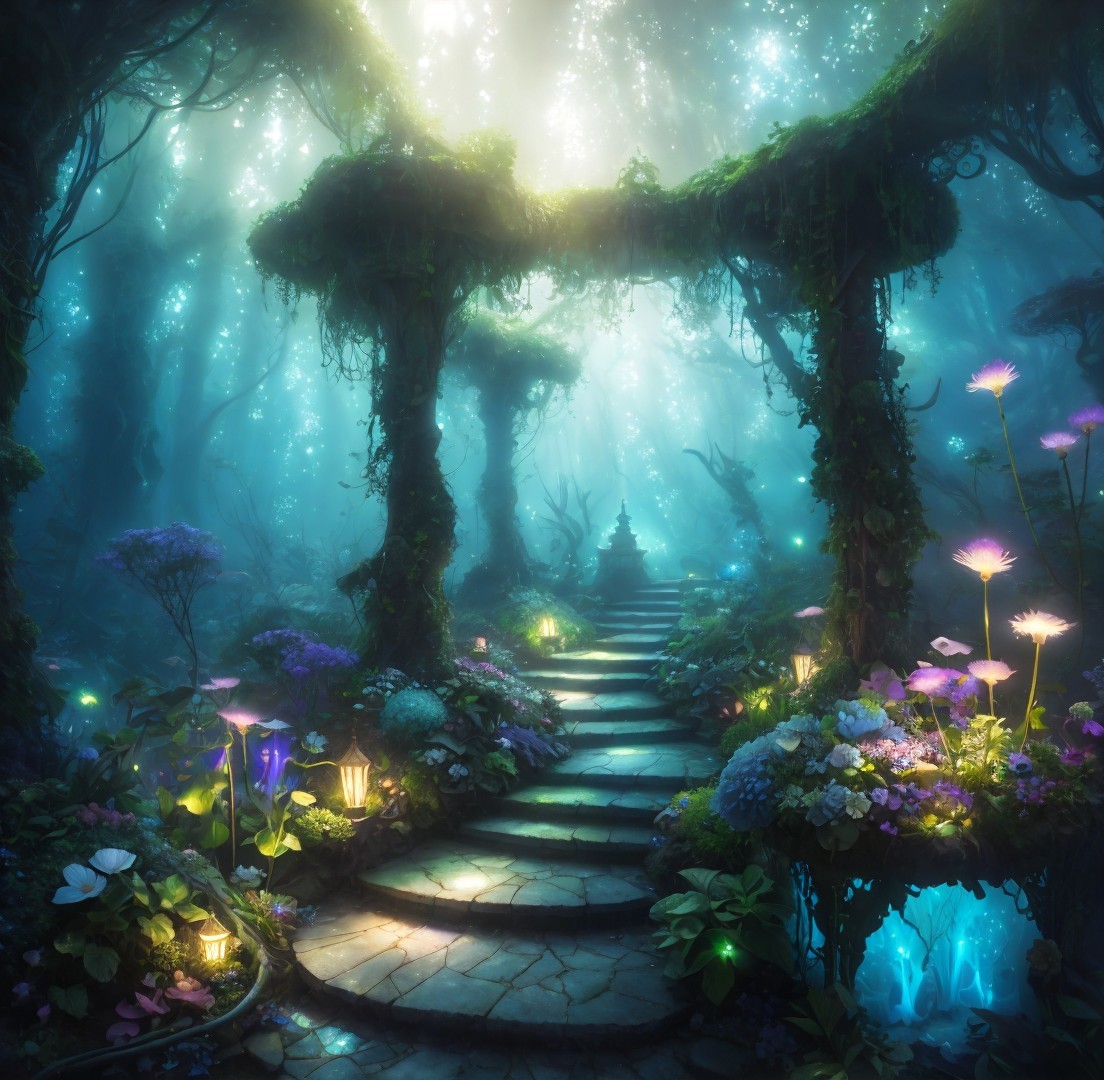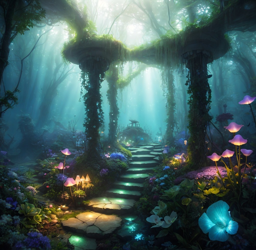 a dreamy messy whimsical beautiful garden in the middle of a forest deep in the ocean floor, blue light beams, organic architecture, ethereal, bioluminescent, extreme wide angle shot, dreamy, surreal concept art, highly detailed, dynamic lighting, hazy misty gloomy, fairy tale, watercolor, beautiful, masterpiece