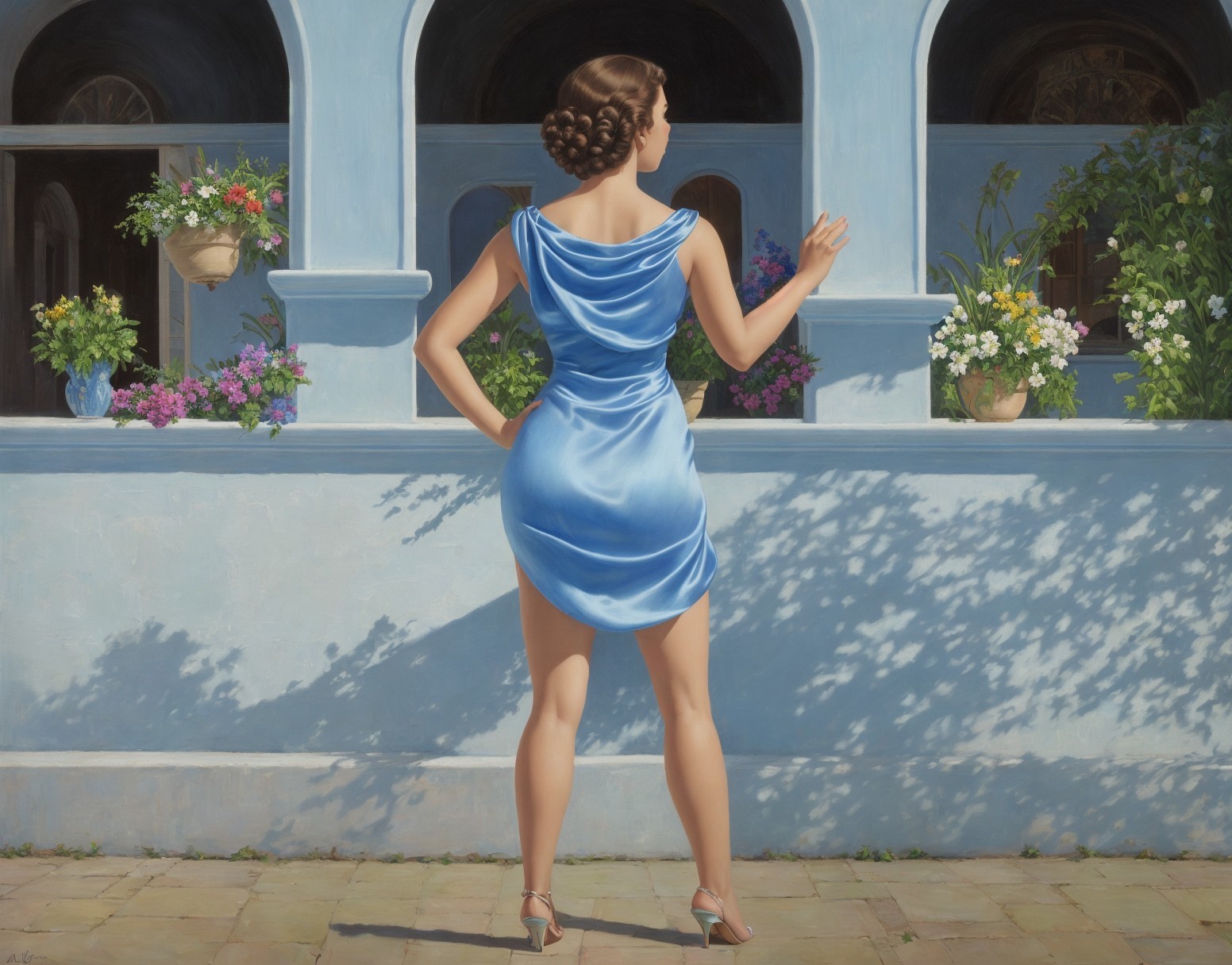 + Prompt:back view young barefoot woman in blue silk dress; standing in a courtyard; flower shop behind arched windows in a blue stucco wall; alberto vargas pinup girl
