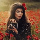 A young woman stands in a vibrant field of red poppies, holding a camera. She has long, dark hair adorned with poppy flowers, exuding a confident and artistic vibe against a picturesque backdrop.