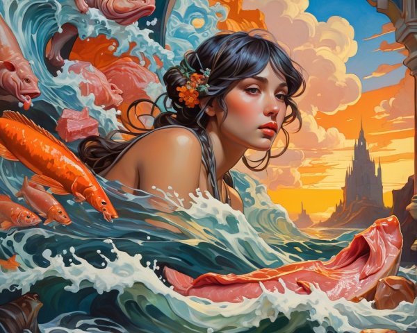 A side profile of a young woman with an intricate cosmic background. Ethereal patterns and glowing symbols surround her head, suggesting a connection to the universe and knowledge.