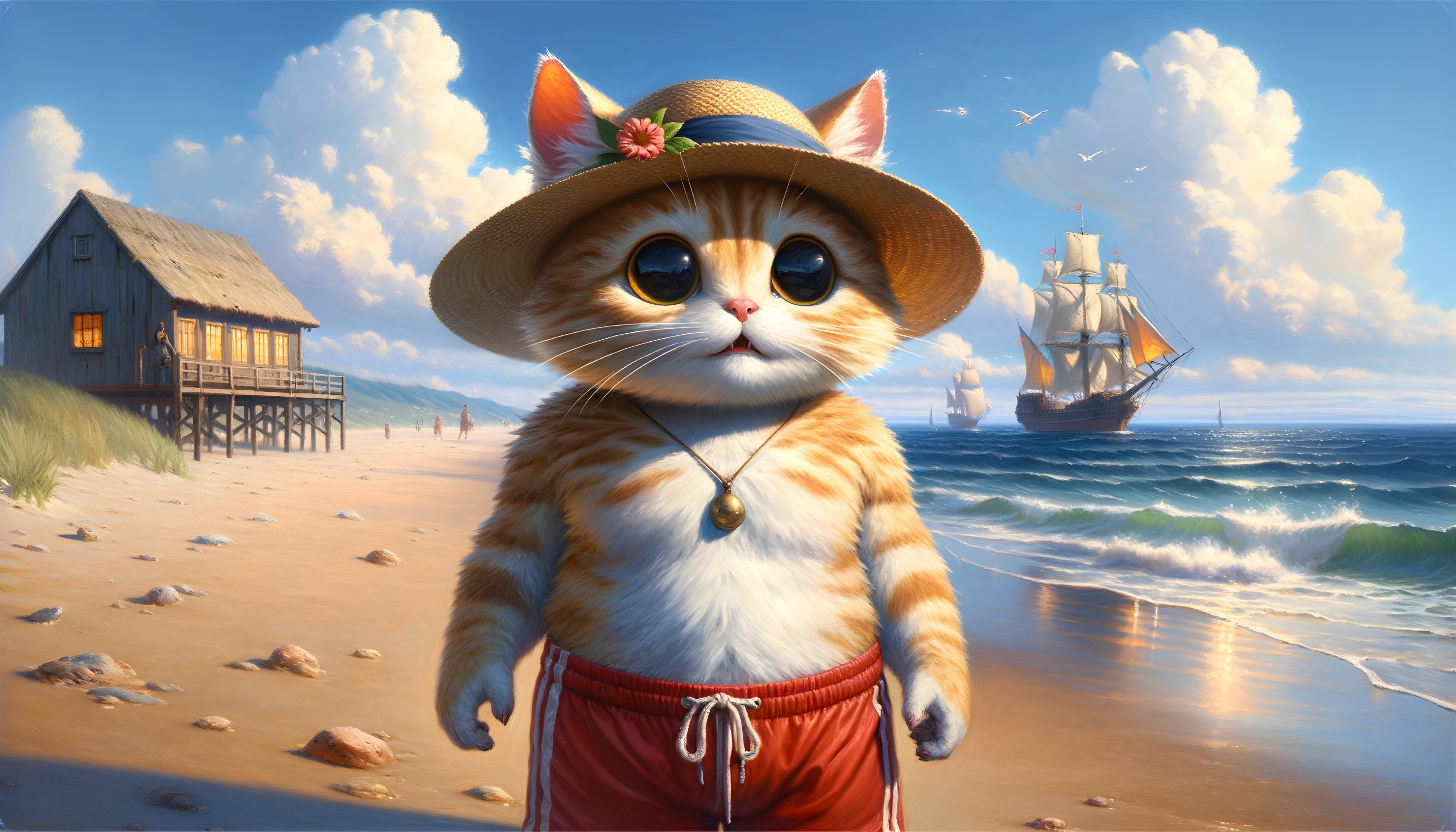 An anthropomorphic cat in a hat and shorts stands on a sunny beach with a ship in the background.