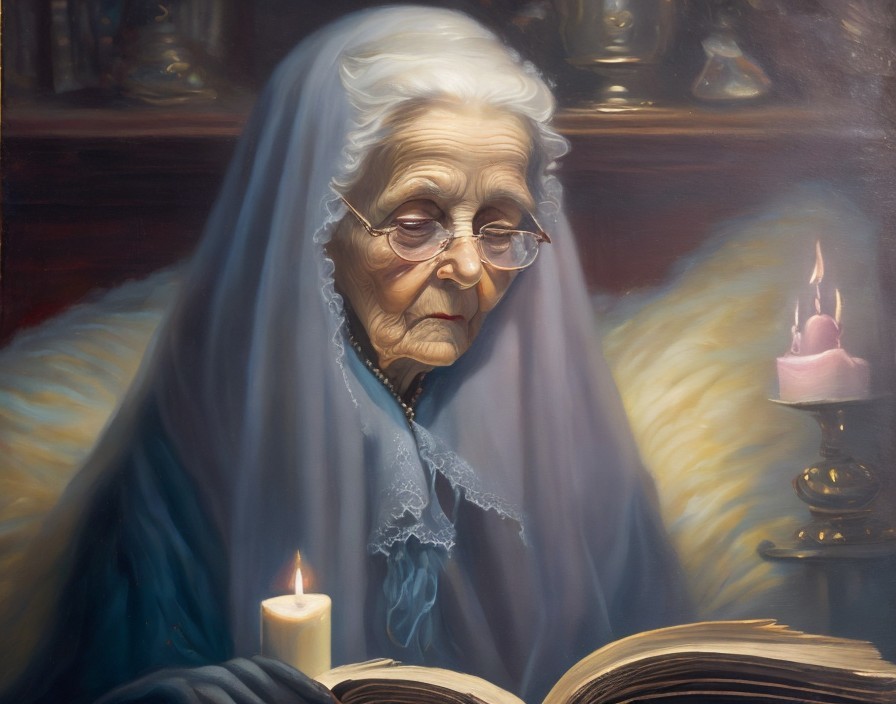 Prompt: Detailed oil on canvas painting portrait of Eldritch blurry misty shadowy smoky vintage crooked semi-diaphanous limpid old-granny-ghost with bright blue-glowing eyes in old playing room reading book for sleeping kids, night mist glowing, glowing candles, edwardian home playing kid's room design, stuffed toys, by Omar Rayyan, Jordan Grimmer, Rafal Olbinski, Goya