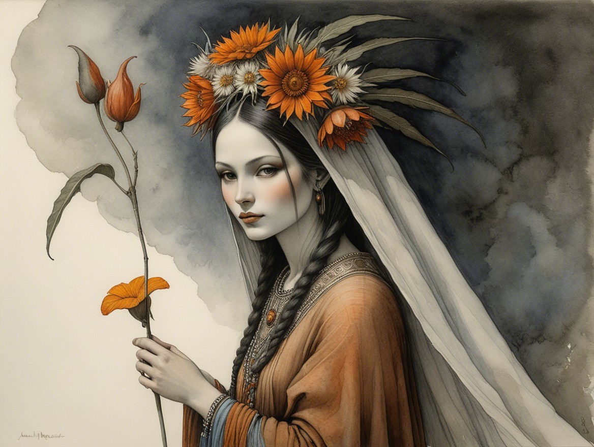 A mystical female figure with antlers and orange flowers in her hair, wearing a flowing cape, with a dark and light ethereal background.