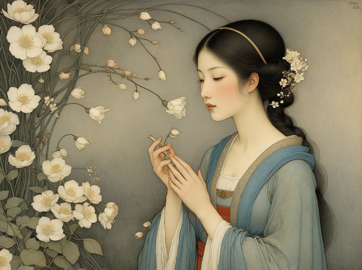 A full-shot image with a portrait of a beautiful woman and a white parrot with an orange crest on a branch between white flowers, in a Renaissance Pre-Raphaelite style painting, painted by Leona Edoon. The woman has long dark hair styled in a braid that falls over her shoulder