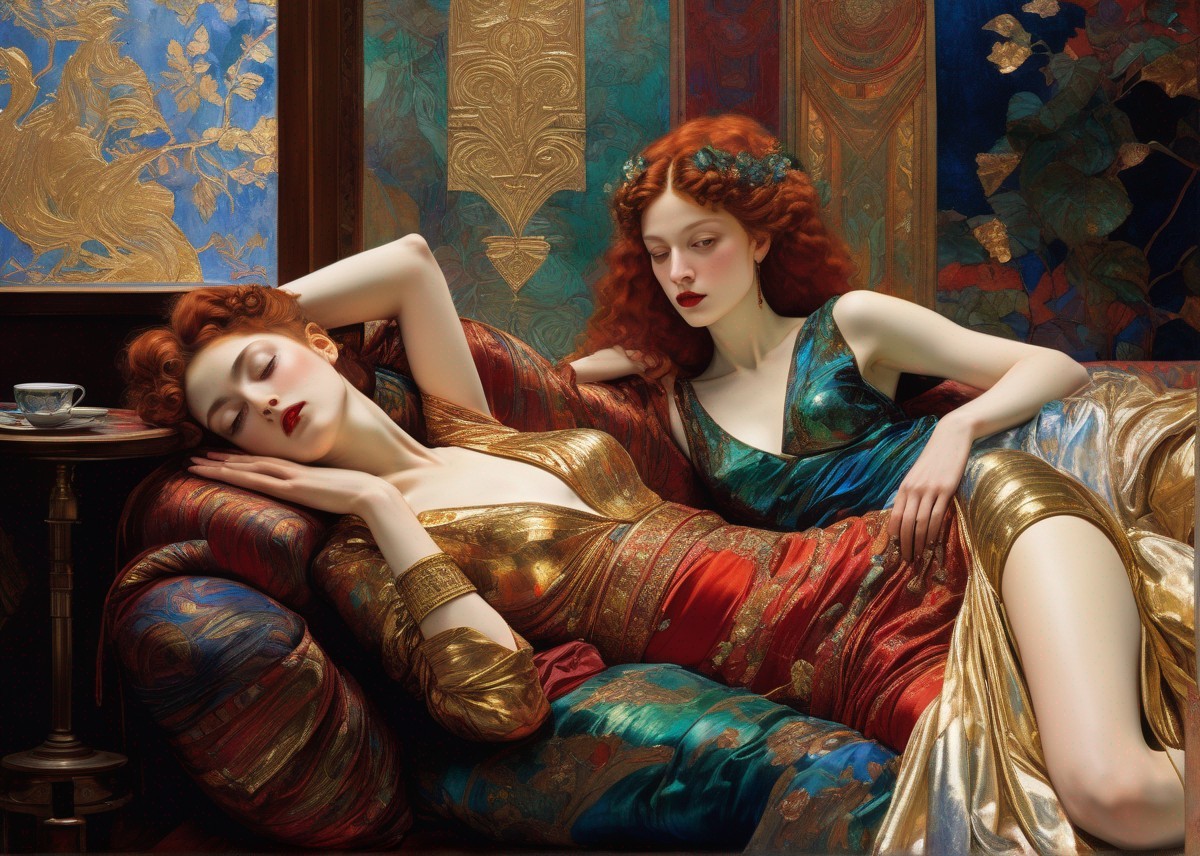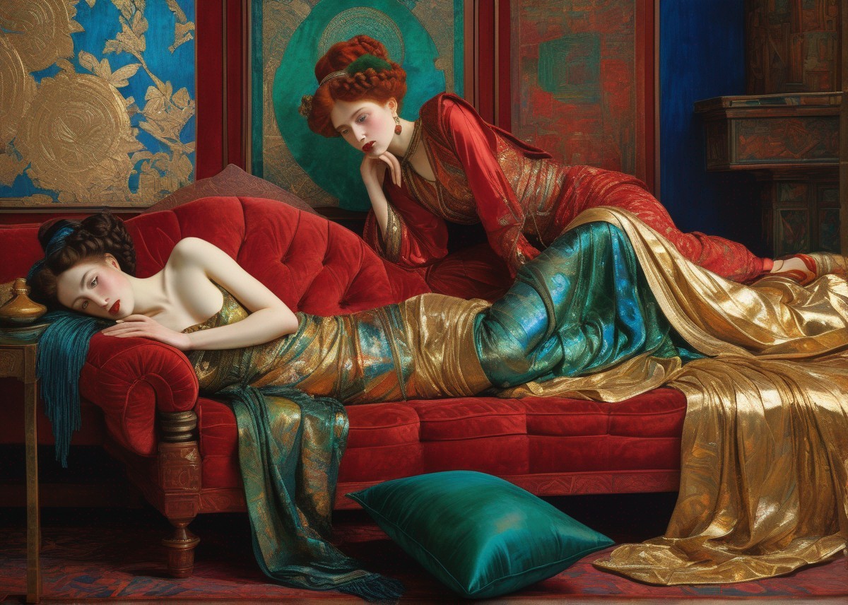 + Prompt:Art deco with 3d detail and golden foil, double image, Egon Schiele painting a two different pre-raphaelite oriental ladies in Crimson Court Room with pillows iridescent blue and green, dynamic poses, silk iridescent texture in watercolor and ink, vibrant colors with gold foil detail, by William Holman Hunt, Tomasz Sętowski, Enki Bilal, Vladimir Fedotko, Pietro Annigoni, Milo Manara, Botticelli, Catrin Welz-Stein, Jean Metzinger, Klimt, perfect eyes, perfect face,