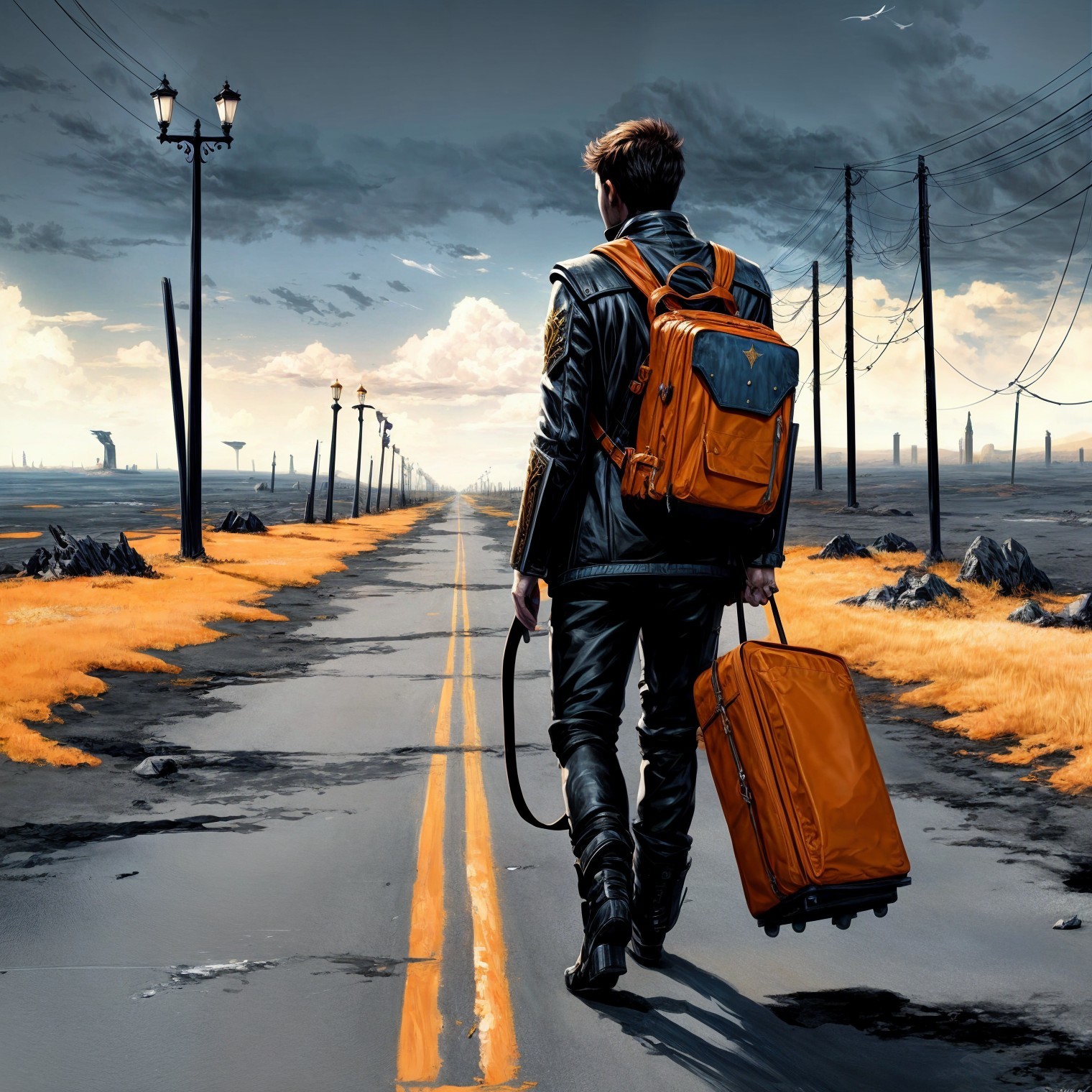 A lone traveler in a dark hat and colorful backpack walks down a deserted road lined with vintage lamp posts. The landscape features distant buildings under a dynamic sky, hinting at adventure ahead.