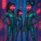 Three stylized women in green jumpsuits and oversized glasses stand confidently on a vibrant city street, with colorful buildings and trees in the background. A neon sign reads "HUSVE."