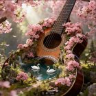 A serene scene features a large acoustic guitar nestled among blossoming pink cherry trees. Swans glide on a tranquil pond, creating a peaceful, enchanting atmosphere. Nature and music blend harmoniously.