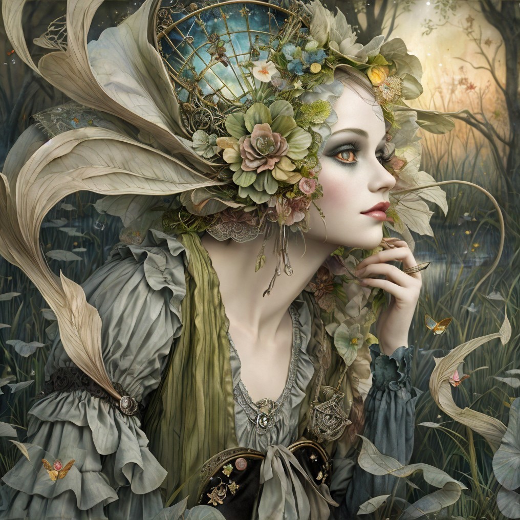 Close up, impish devious beautiful Pierrot creature in a magical wetland marsh maze, in the style of Alexander Jansson. by Catrin Welz-Stein, Michael Parkes