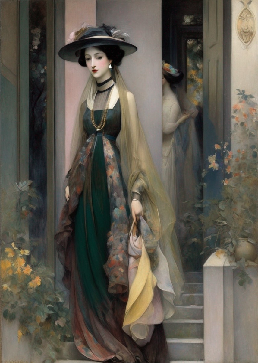 Stylized painting of woman with dark hair, floral headpiece, sheer gown, sea, and