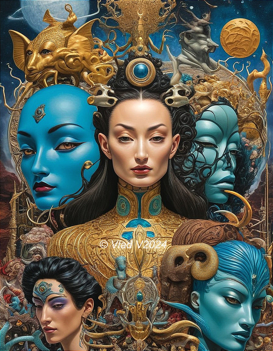 A vibrant fantasy artwork featuring a central figure with multiple faces surrounded by surreal elements and golden animal figures.