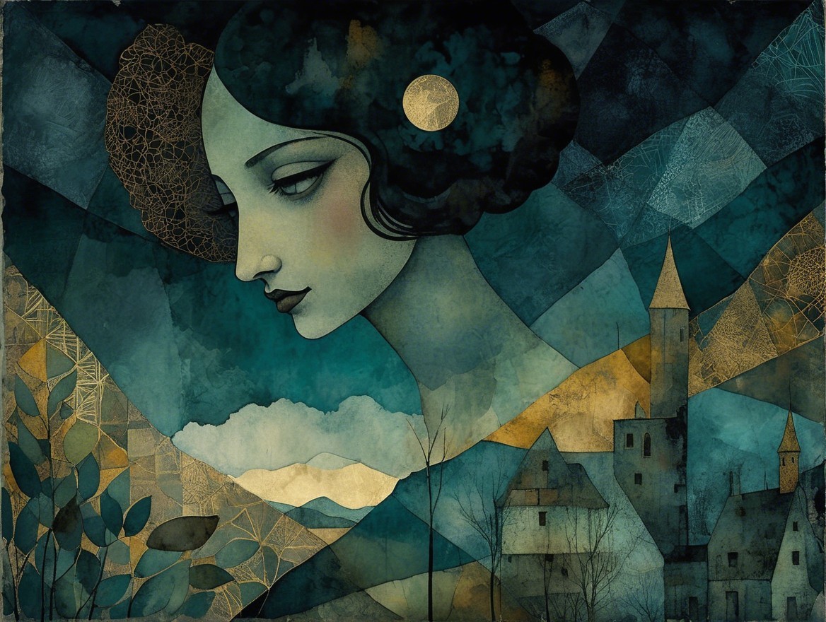 Patchwork fading tones of melancholy vintage summer nostalgia, soul search in portrait in ochre, patina of wine stains, mercury glass. Light and gossamer haze. art brut, moody, somber, desaturated colors, in the style of Paul Klee, Arthur Rackham, Banksy Stunning stylized, beautiful woman, intricate zentangle illustration, watercolor and ink painting, meticulous detail with fine pen strokes, intricate patterns, fractals, ochre and indigo colors, Amanda Clark, Catrin Welz-Stein, Zdzisław Beksiński, and Dee Nickerson